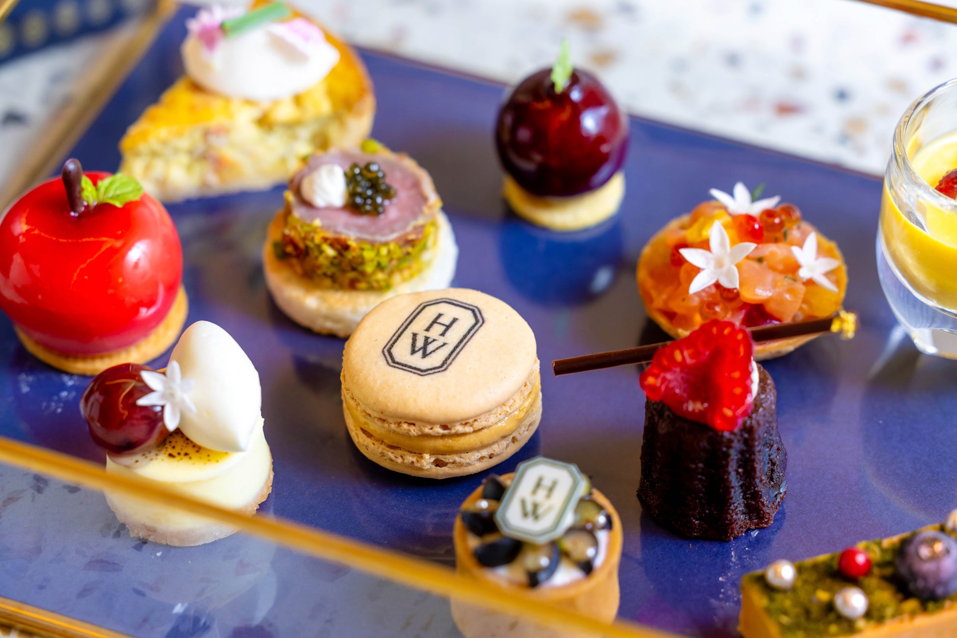 今回のアフタヌーンティーでは、ハリー・ウィンストンが誕生したニューヨークをテーマに、赤いリンゴの形をした「ニューヨーク・ミニアップル」などのニューヨークスイーツや、宝石のように煌めく「ブルーベリー スミレ タルトレット」などのジュエルスイーツ、HWロゴをあしらったスイーツほか、心躍るセイヴォリーメニューをラインナップ。ガラスのジュエリーボックスに丁寧に並べて、エレガントで繊細なアフタヌーンティーに仕上げました。また、ブロードウェイのキラキラと輝くライトを表現したジュエリーがイメージのパフェ「シティ・ライト」もご用意しております。