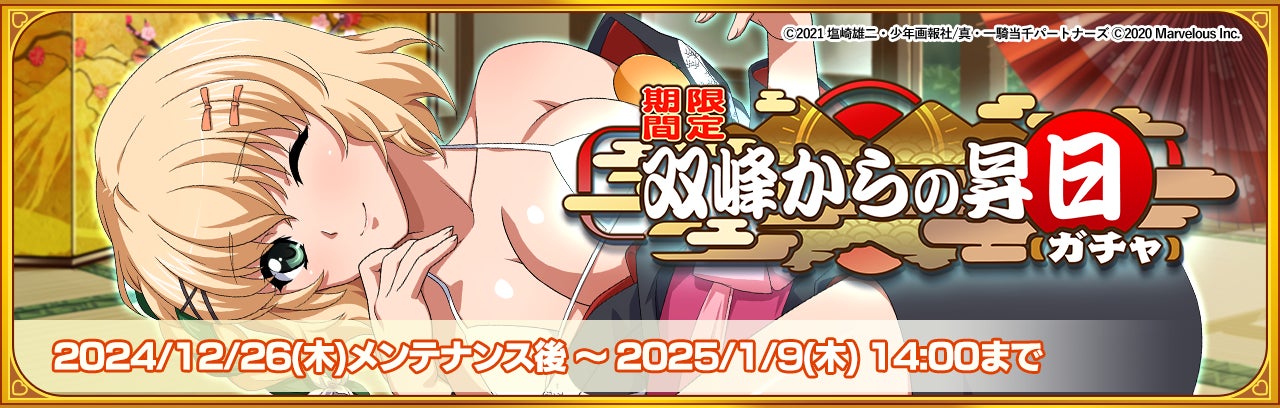 株式会社マーベラス(代表取締役社長 佐藤澄宣/所在地:東京都品川区)は、大人気シリーズ「一騎当千」のAndroid/iOS/PC向けゲームアプリ『一騎当千エクストラバースト』で、2024年12月26日(木)からシナリオイベント「大願成就!和装乙女と鏡餅の秘密」を開始したことをお知らせいたします。