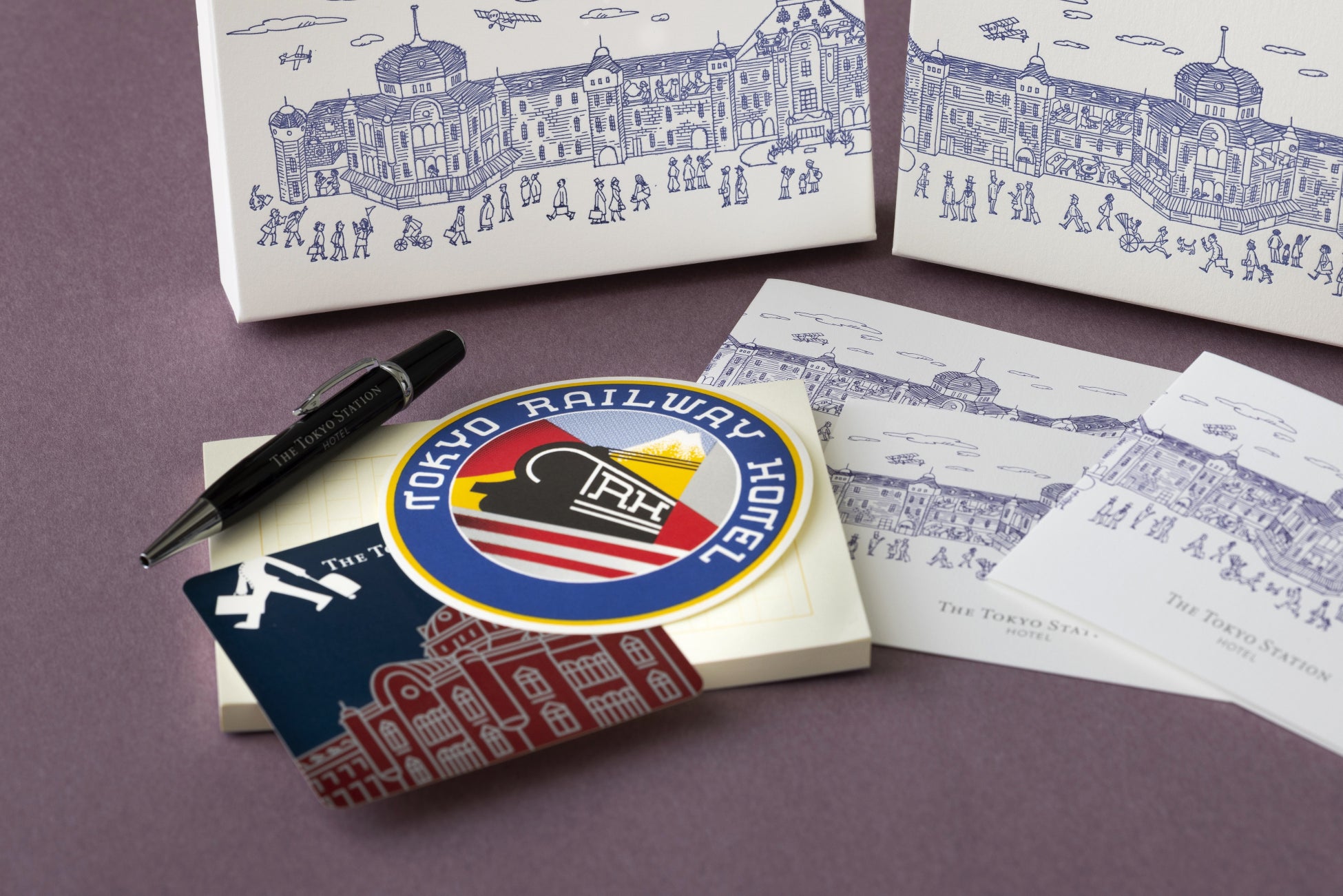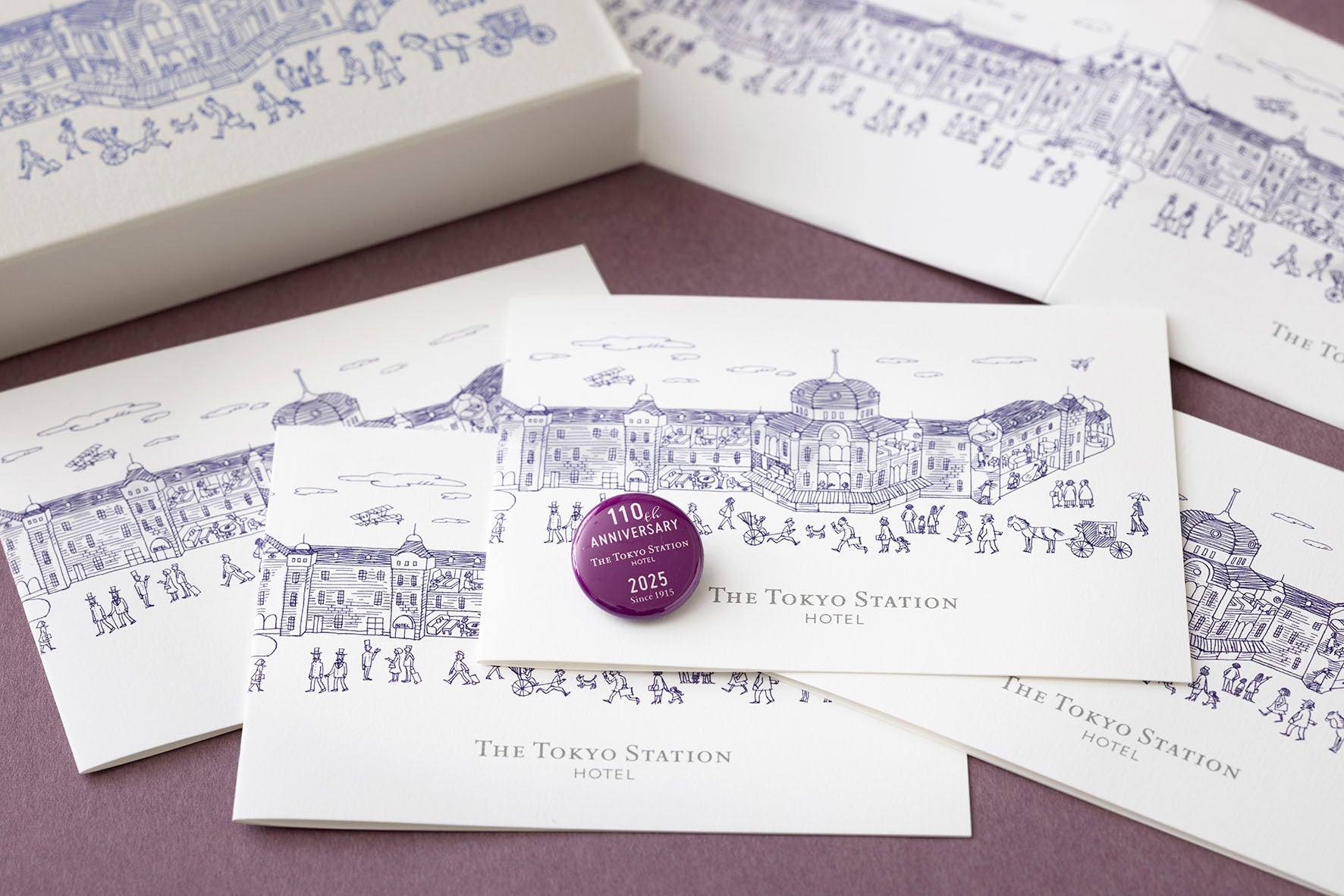 今年開業110周年を迎える東京駅丸の内駅舎に位置する東京ステーションホテル(所在地:東京都千代田区丸の内1-9-1)では、発売以来大変ご好評いただいている文豪セットを、イラストレーションボックスに入れて新たに、公式オンラインショップにて販売を開始いたします。ホテルの外観となる、東京駅丸の内駅舎の北側をモチーフにしたこのボックスには、ホテルの歴史と日常が繊細に描かれており、ご滞在の記念としてはもちろん、大切な方への贈り物にも最適です。イラストレーションには、ホテル館内の様子やゲスト、スタッフの姿に加え、外のにぎわいも描かれており、時代を超えたさまざまな情景が重なり合うことで、まるで過去と現在が交差するような世界観が広がっています。