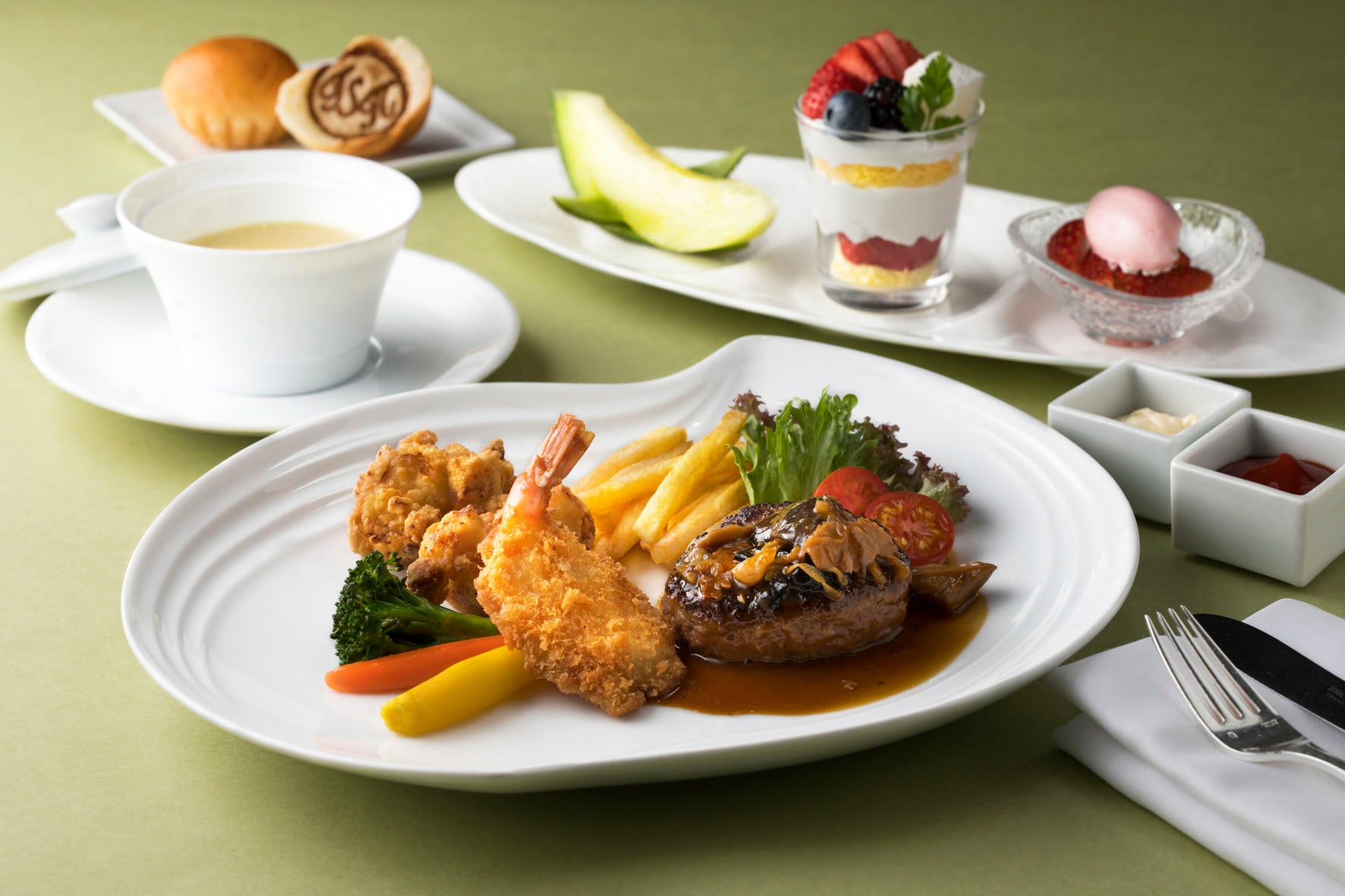 お食事にご一緒されるお子さま向けに、ほどよいボリュームのワンプレートまたはミニコースをご用意しています。人気の〈文豪セット〉のお土産付きプランは9月30日(火)まで。お子さまの食育として、さまざまな食材や旬の食べ物に触れ、食事のマナーや感謝の心を育む体験の場としてもご利用いただけます。
