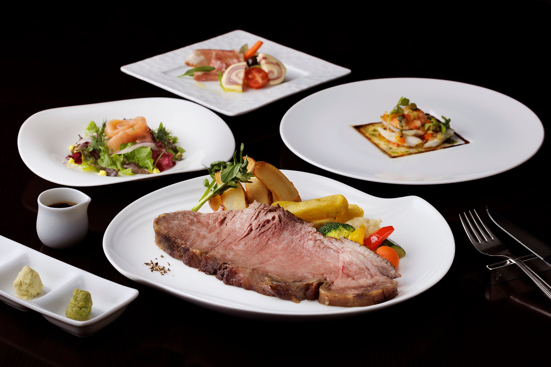 ・黒毛和牛サーロインのローストビーフ ポムフリット&温野菜添え ジュドジャポネーズ レフォール添え