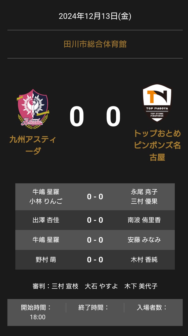 ノジマTリーグ 2024-2025 公式戦 12月13日開催 九州アスティーダ vs トップおとめピンポンズ名古屋 オーダー発表