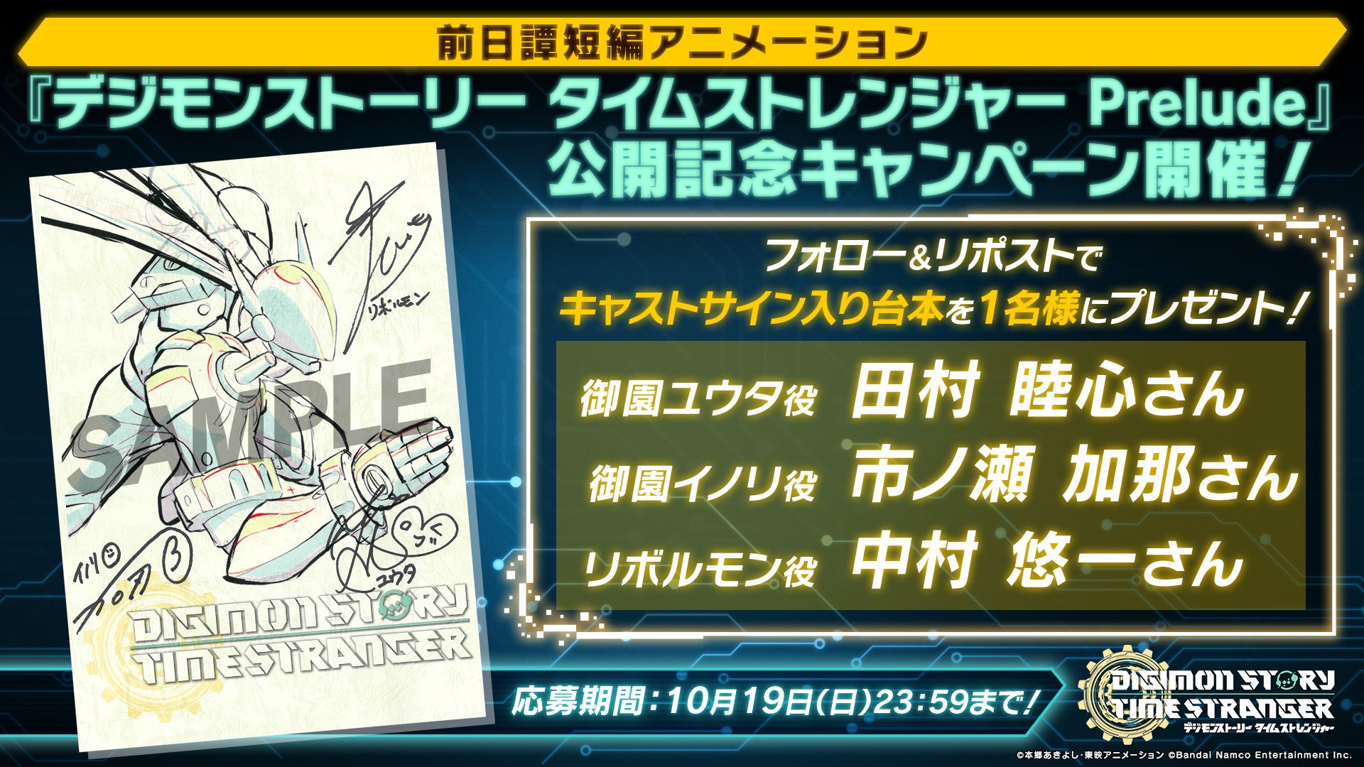 公開を記念して、 「御園ユウタ」役の田村 睦心さん、「御園イノリ」役の市ノ瀬 加那さん、「リボルモン」役の中村 悠一さんのサインが入った『デジモンストーリー タイムストレンジャー Prelude』の収録台本が当たるプレゼントキャンペーンを開催!「デジモンゲーム」公式Xより是非ご参加ください!
