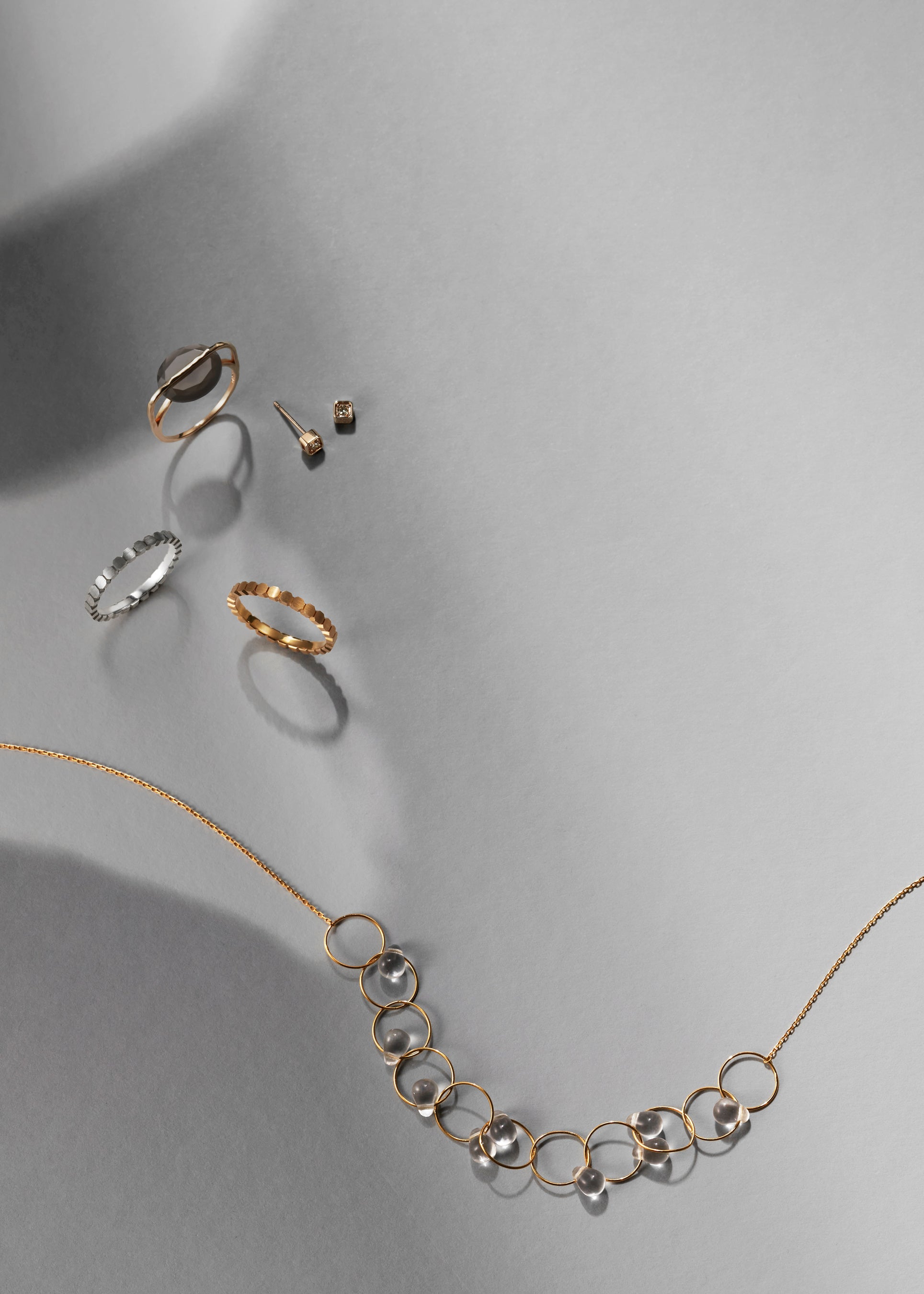 軽やかなベネチアンチェーンやピンクアメシスト・シトリンを使ったジュエリーで時代の先取りを。