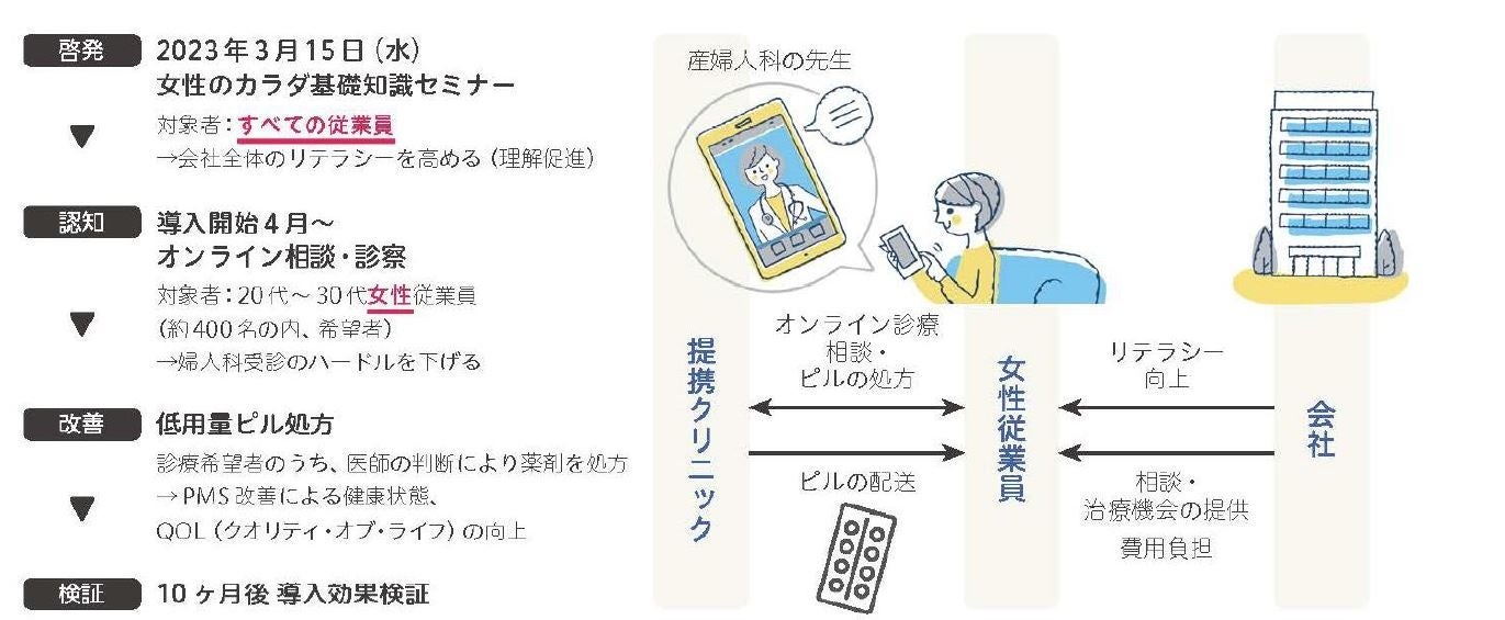 ・20代~30代の女性従業員のうち、希望者にオンラインでの婦人科診療および月経前症候群(PMS)や月経困難症の改善策のひとつである低用量ピルの処方・配送を行い、健康状態とQOL(クオリティ・オブ・ライフ)の向上を図ります。