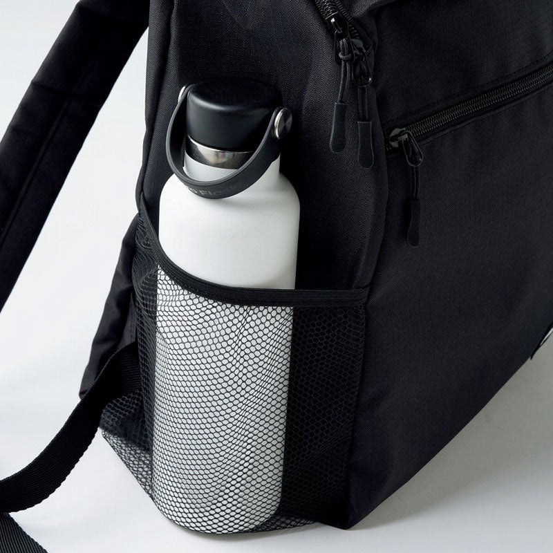 ブラックロゴがアクセントになったバックパックは、約23リットルの大容量。両サイドに便利なメッシュポケット付きで、水筒や折りたたみ傘もすっぽり入ります。通勤・通学はもちろん、アウトドアにも使えるアイテムです。