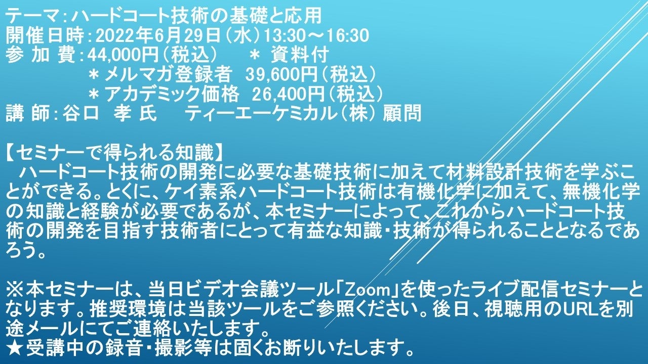 先端技術情報や市場情報を提供している(株)シーエムシー・リサーチ(千代田区神田錦町: https://cmcre.com/ )では、 各種材料・化学品などの市場動向・技術動向のセミナーや書籍発行を行っておりますが、 このたび「ハードコート技術の基礎と応用」と題するセミナーを、 講師に谷口 孝 氏 ティーエーケミカル(株) 顧問)をお迎えし、2022年6月29日(水)13:30より、 ZOOMを利用したライブ配信で開催いたします。 受講料は、 一般:44,000円(税込)、 弊社メルマガ会員:39,600円(税込)、 アカデミック価格は26,400円(税込)となっております(資料付)。