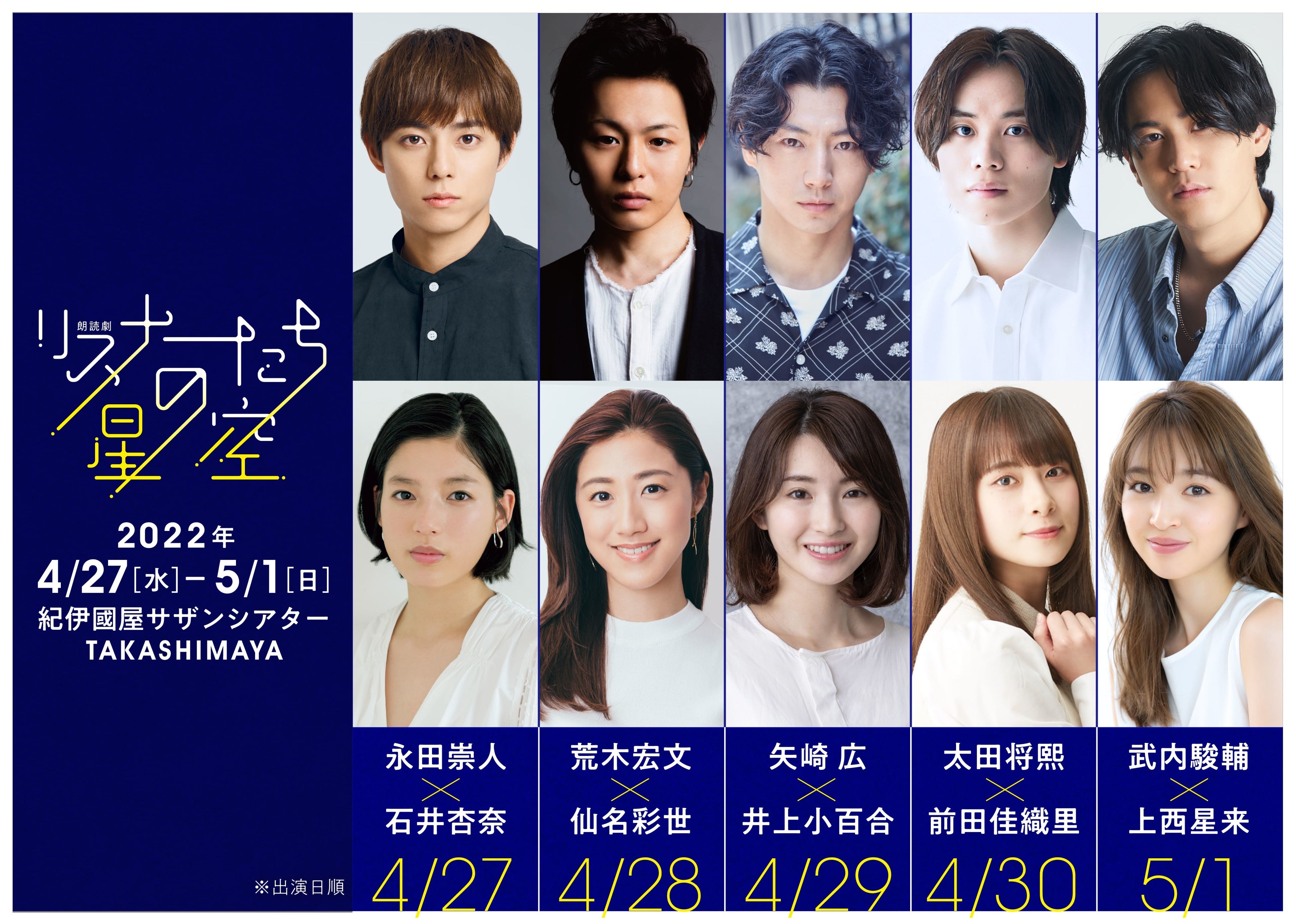 出演者は、永田崇人・石井杏奈、荒木宏文・仙名彩世、矢崎広・井上小百合、太田将熙・前田佳織里、武内駿輔・上西星来の男女ペア5組が日替わりで上演します。