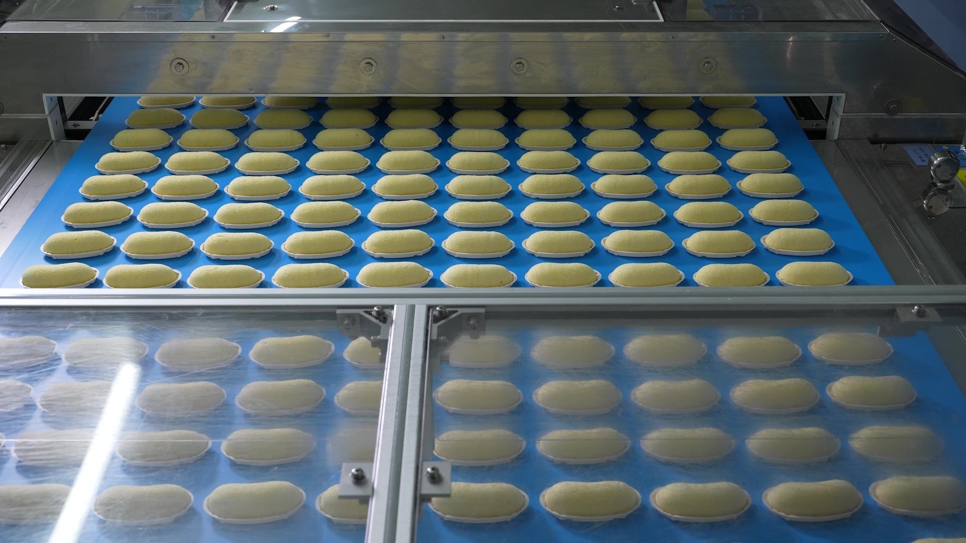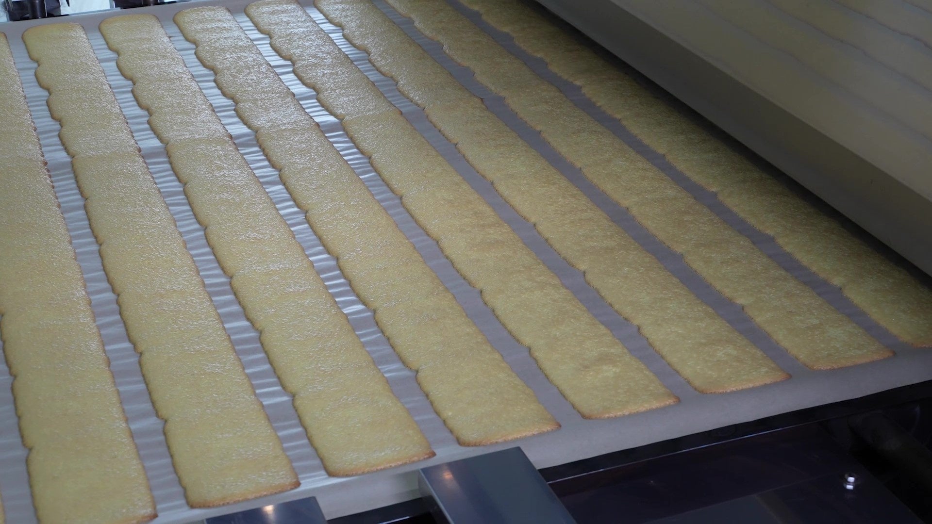 スポンジの工夫、ふたつ目は「焼き蒸し」。全長12メートルの巨大トンネルオーブンでじっくり焼き上いた後、さらに蒸すことで、東京ばな奈独自のしっとりふわふわ食感が生まれています。