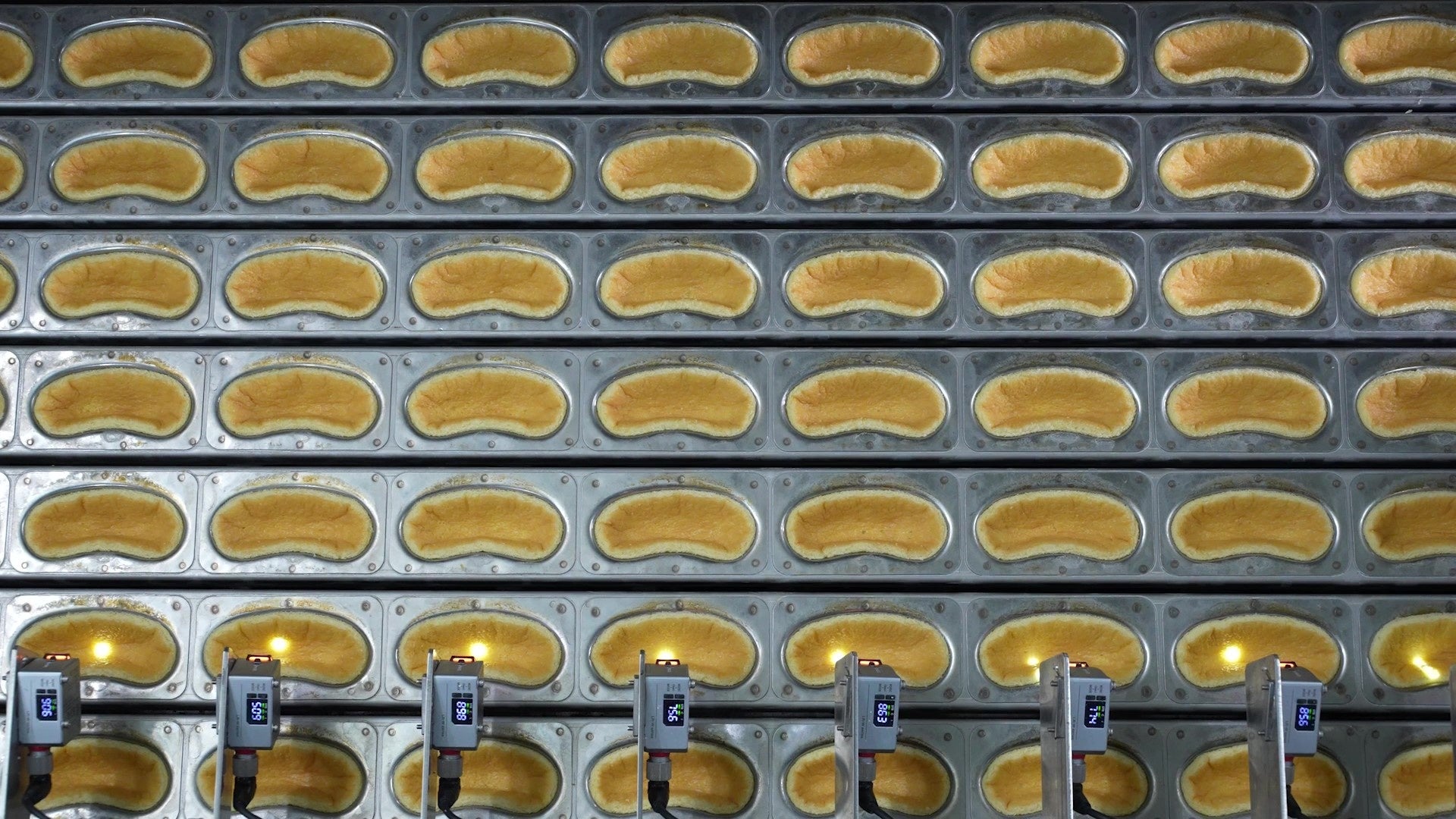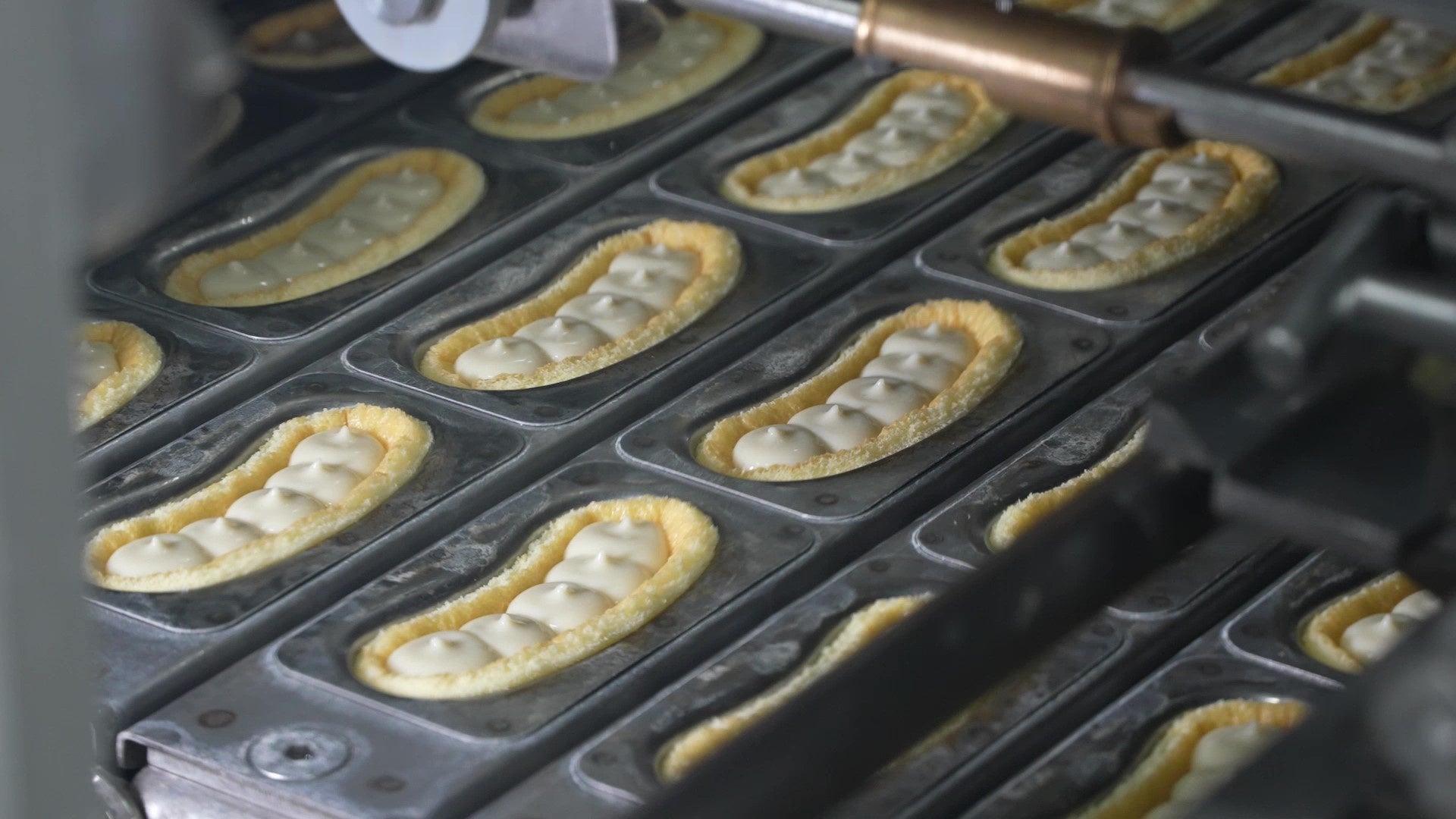 破れやすく繊細なスポンジ生地で、不規則な3Dカーブの形に仕上げるのは、実はとても難しい。角度を細部まで計算しつくした「東京ばな奈専用の焼型」と、絶妙の力加減で素早く正確にスポンジを型にフィットさせる、専用マシンの発明のおかげです。