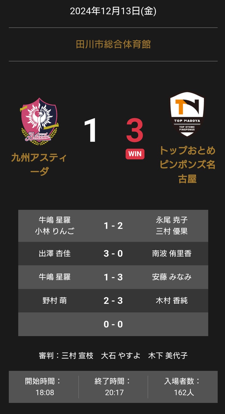 ノジマTリーグ 2024-2025 公式戦 12月13日開催 九州アスティーダ vs トップおとめピンポンズ名古屋 試合結果