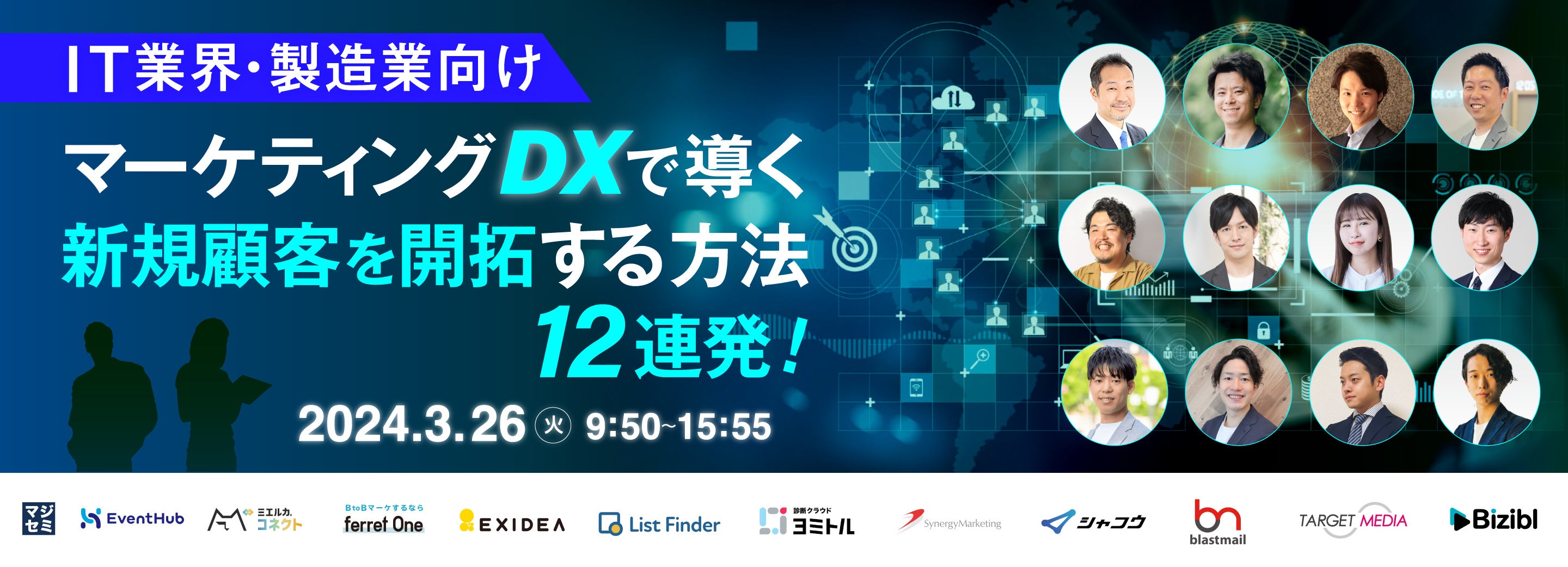 課題は山積みです。そこで本カンファレンスではプロ12社をお呼びし、IT業界・製造業の方向けにマーケティングDXで導く新規顧客を開拓する方法についてお伝えします。「IT業界・製造業」に特化したオンラインカンファレンスでは、日本最大級となっておりますので是非お申し込みくださいませ!