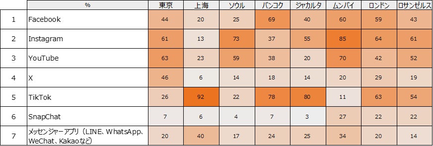 ●ソーシャルコマースの主な購入先として、特に高い利用率がみられたのは「TikTok(抖音)」で、中でも上海とジャカルタ、バンコクでの利用率が高く7割を超える。また、「Instagram」や「Facebook」などのプラットフォームもよく利用されているが、東京では「YouTube」が最も利用されている。