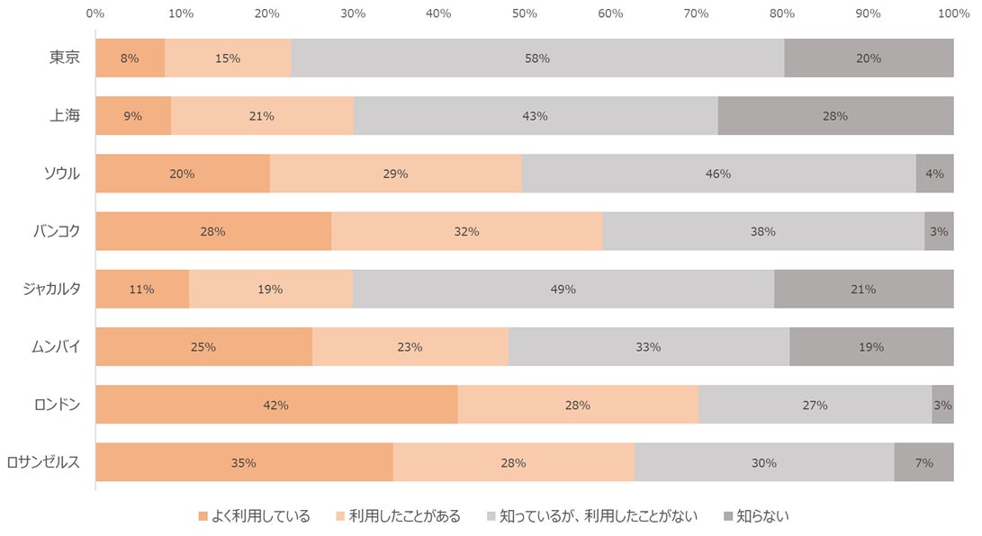 ●SHEINやTemuなどの中国格安オンラインショッピングサイトの購入経験は全体的に高く、特にロンドン(70%)とロサンゼルス(63%)、バンコク(60%)の3都市が顕著だ。一方で、東京とジャカルタでは利用率が低く3割程度にとどまった。