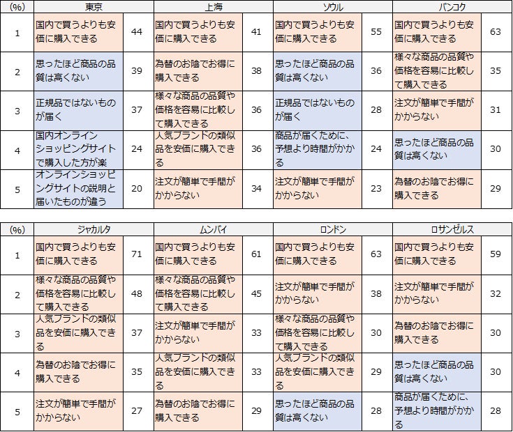 ●一方、東京とソウルでは、他都市と比べて品質面への懸念が多くみられ、「思ったほど商品の品質は高くなかった」や「正規品ではないものが届く」などの回答が多くあげられた。