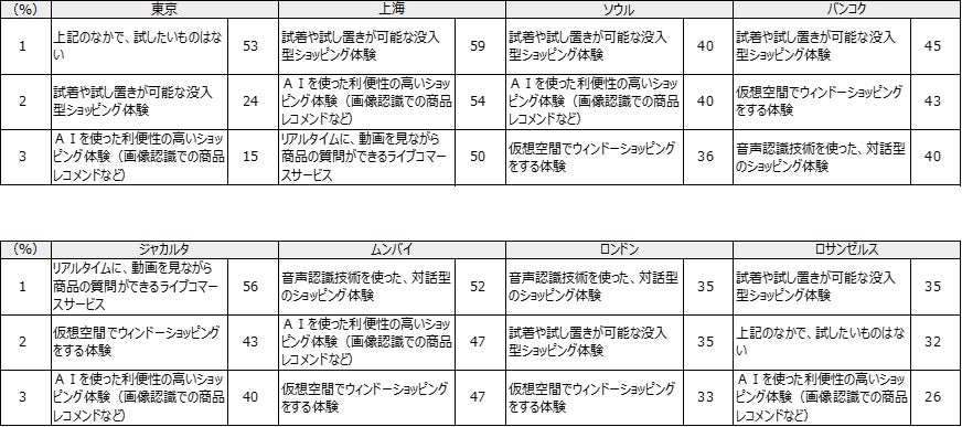 ●関心の高いテクノロジーとしては、試着や試し置きが可能な没入型体験や画像認識やレコメンドなどAI活用、仮想空間でのウィンドーショッピングなどがあげられる。一部都市ではライブコマースや音声による対話型コマースなど、よりインタラクティブなショッピング体験への需要が高い傾向にある。ライブコマースは、ジャカルタと上海、対話型コマースはムンバイでは高い関心を寄せられ、各都市で5割を超えた。