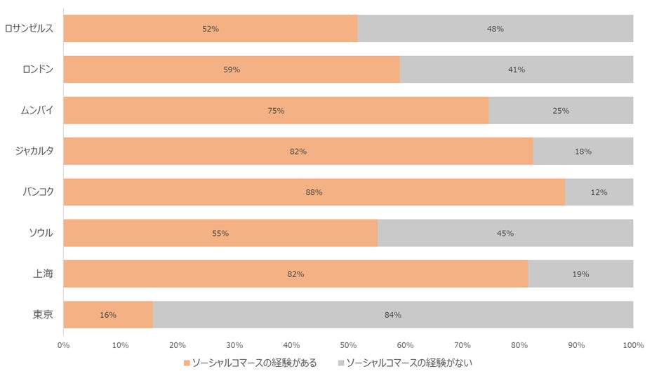 ●ソーシャルコマースの利用経験が東京を除く7都市で過半数を超えており、特にジャカルタ、上海、バンコク、ムンバイでは高い割合で利用されている。