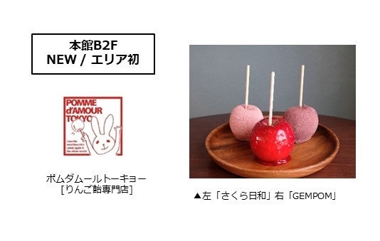 本館B2Fには話題のりんご飴専門店「ポムダムールトーキョー」がエリア初出店。「さくら日和(さくら・ストロベリー味)」「GEMPOM(赤ブドウ・シナモン・カシス味)」は池袋パルコ店でしか楽しめない限定商品となっております。