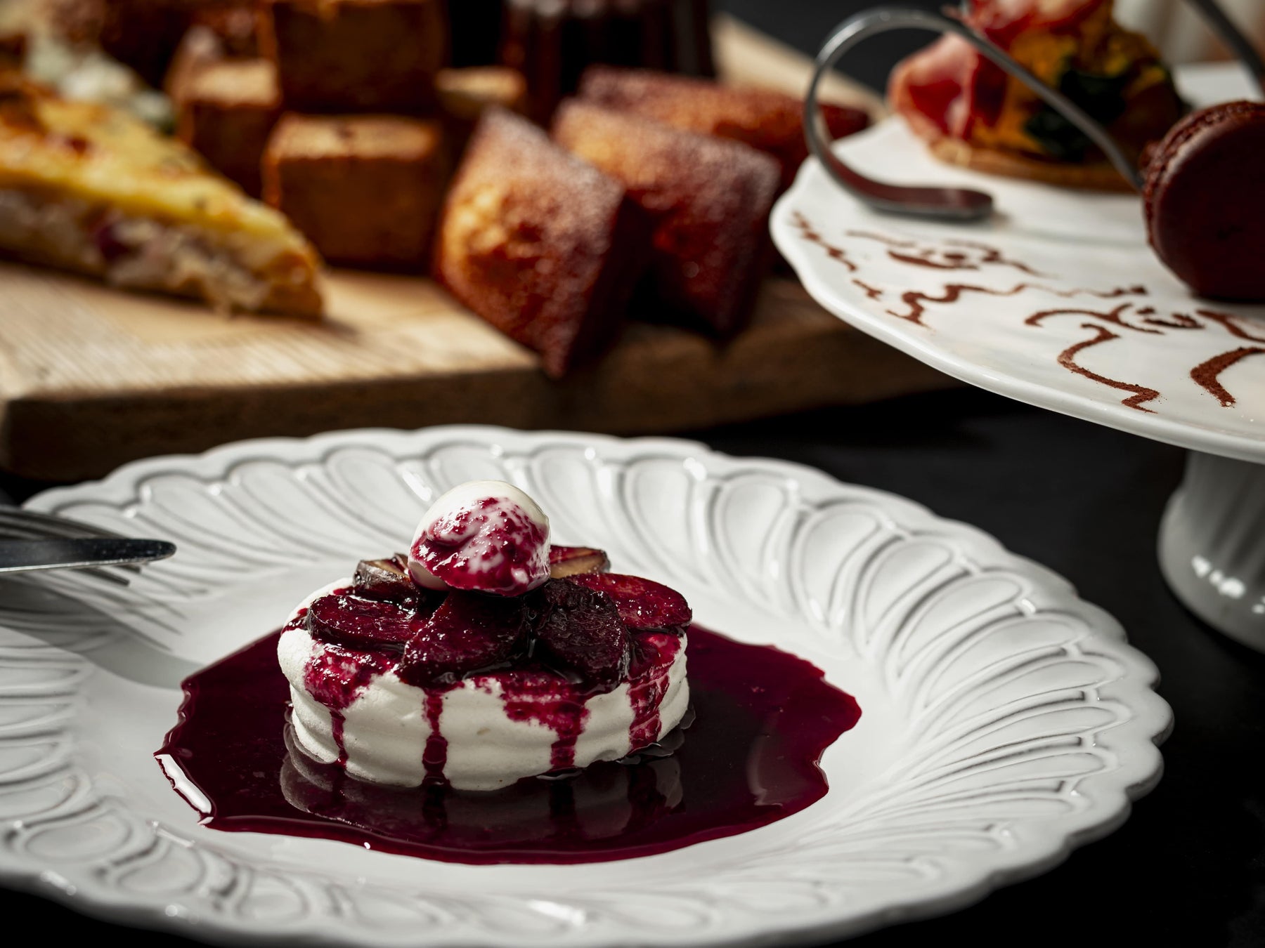 Main Dessert/メインデザートは、“カシスとマロンクリームのパブロヴァ”をご用意。さっくりしたメレンゲの中に濃厚なマロンクリームと酸味のあるサワークリーム、ヨーグルトアイスを詰め込んだパブロヴァ仕立てです。仕上げにカシスのハーブソースをかけてお召し上がりください。更に、お口直しに白のライオンカップに盛り付けた“白トリュフソルトのポテトチップス“をご用意しました。