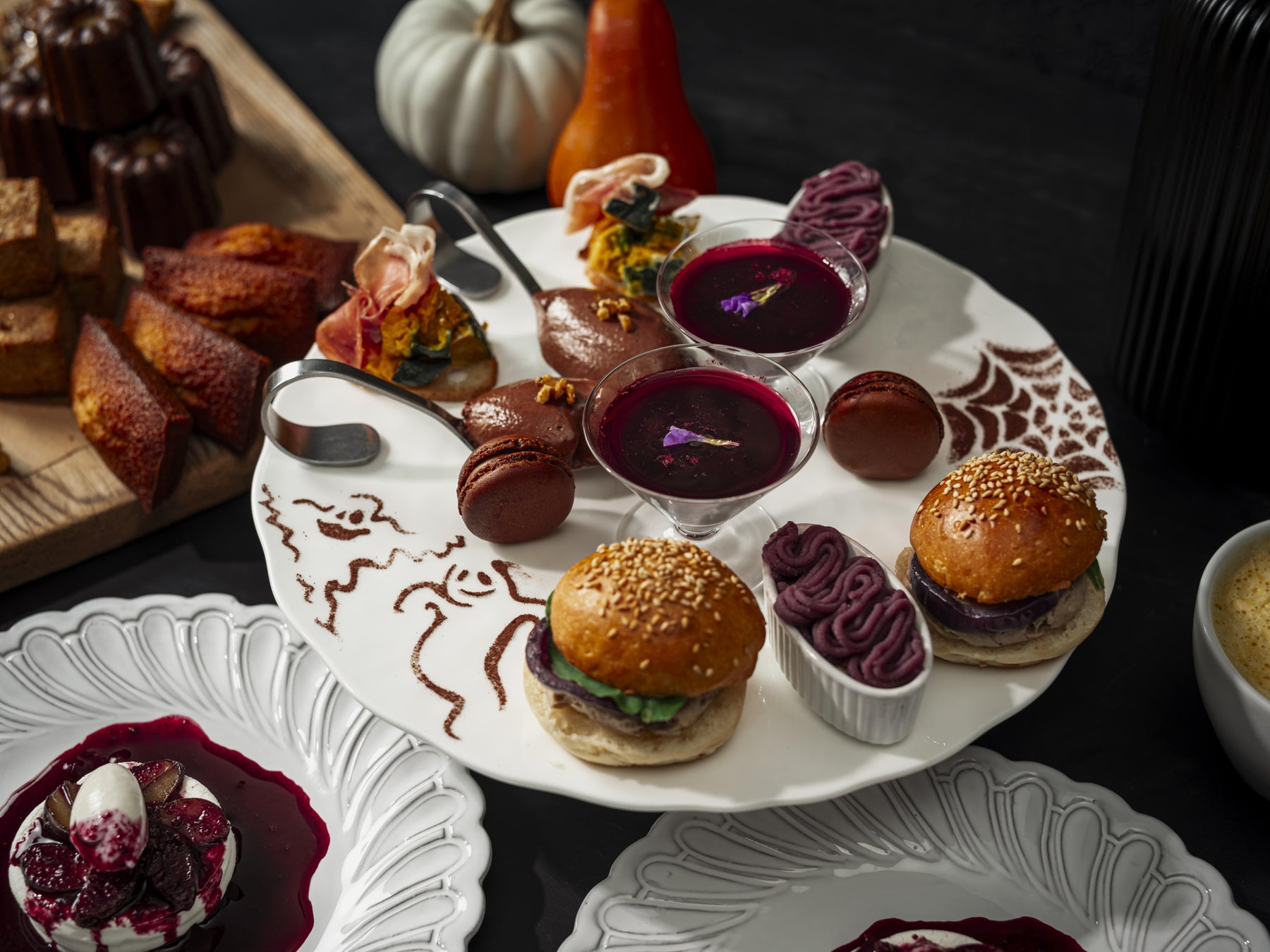 『ハロウィンアフタヌーンティー』は、Seasonal Premier Plate/プルミエプレート(季節の一皿)に、かぼちゃとクミンシードをマスカルポーネで和え、生ハムを盛り付け仕上げにはちみつをかけた“クミン香るかぼちゃと生ハムのカナッペ”、“鴨コンフィバーガー”、レモンヴァーベナシロップとカシスの酸味のある爽やかな“カシスとハーブのglassスープ”、スパイスでじっくりコンポートしたリンゴと秋が旬のイチジクを使用した“イチジクとリンゴのコンポートゼリー”、紫いものモンブランクリームを絞った濃厚な“マロンと紫芋のモンブランブリュレ”、“ショコラマカロン”をご用意。