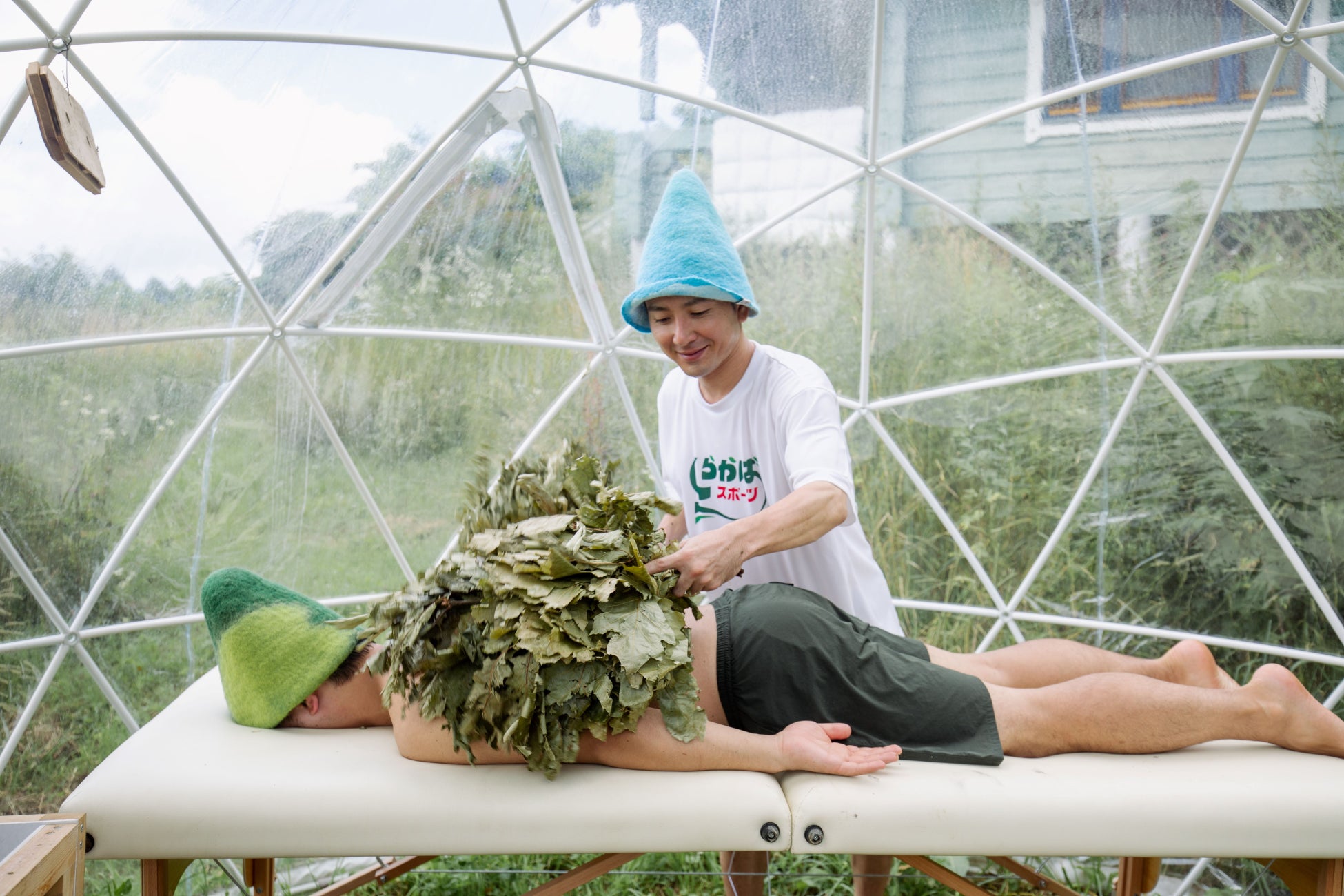 サウナDAYの3日間は、トンボの湯の中央にテントサウナを設置します。男女それぞれの浴室からアクセス可能で、友人や家族とともに、ヨーロッパで古くから親しまれている「ウィスキング」をグループ形式で体験できます。白樺などの植物の枝を束ねた「ウィスク」を使い、身体を叩き、または押し当てて全身をムラなく温める施術は、ウィスキング集団「しらかばスポーツ」のマイスターにより行われます。