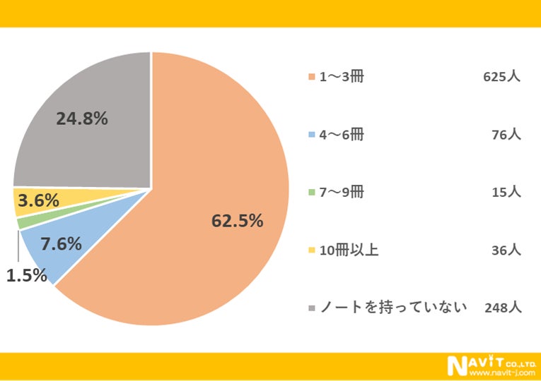 今使っているノートの冊数についてのアンケートでは、「1~3冊」と回答した人が62.5%で、半数を超えていました。また「ノートを持っていない」と回答した人が24.8%で、約4分の1を占めています。