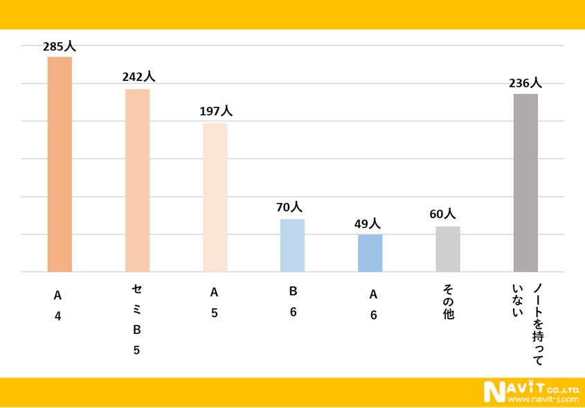 持っているノートのサイズについて複数回答可でアンケートを取ったところ、「A4」が最多で285人でした。2番目は「セミB5」で242人。「ノートを持っていない」の236人を挟んで、「A4」の197人と続きます。