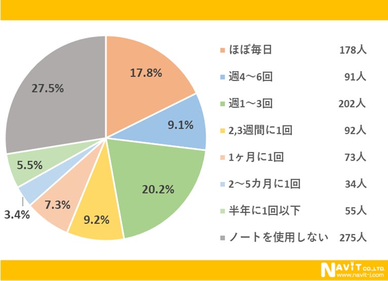 ノートの使用頻度についてのアンケートでは、「ノートを使用しない」という回答が25.6%で最多でした。2番目は「週1~3回」の20.2%、3番目は「ほぼ毎日」の17.8%と続きます。ヘビーユーザーの人と使わない人ではっきりと分かれていることがわかります。