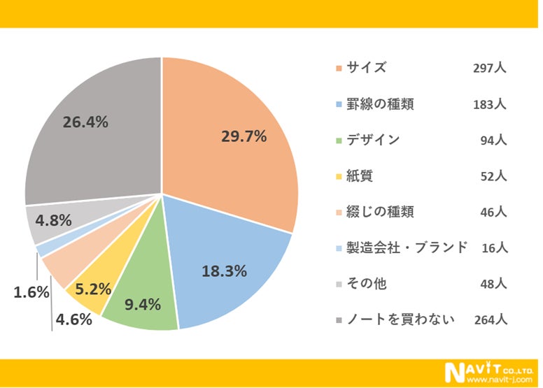 ノート選びの際のポイントについてのアンケートでは、「サイズ」が29.7%で最多でした。2番目は「罫線の種類」で18.3%、3番目が「デザイン」で9.4%と続きます。