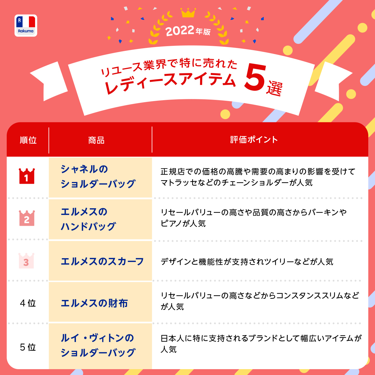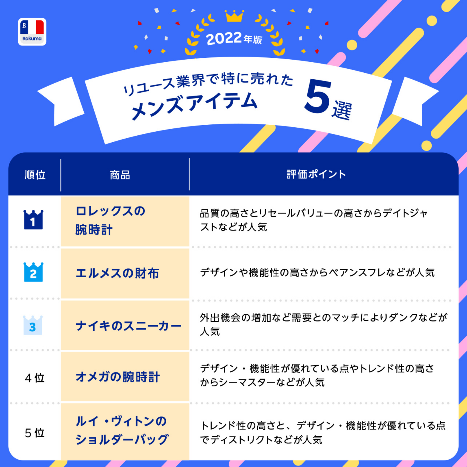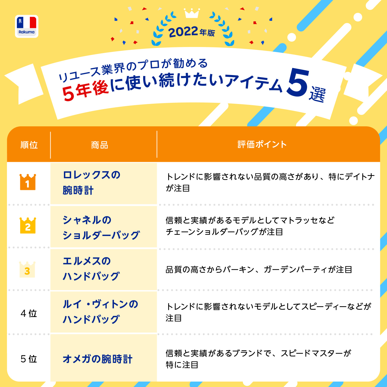 2022年にリユース業界で特に売れた「レディースアイテム」と「メンズアイテム」、5年後と10年後にそれぞれ使い続けたいアイテムとして選出した各ブランド名と商品カテゴリから、より多く挙げられた上位5アイテムをランキングで選出しました。