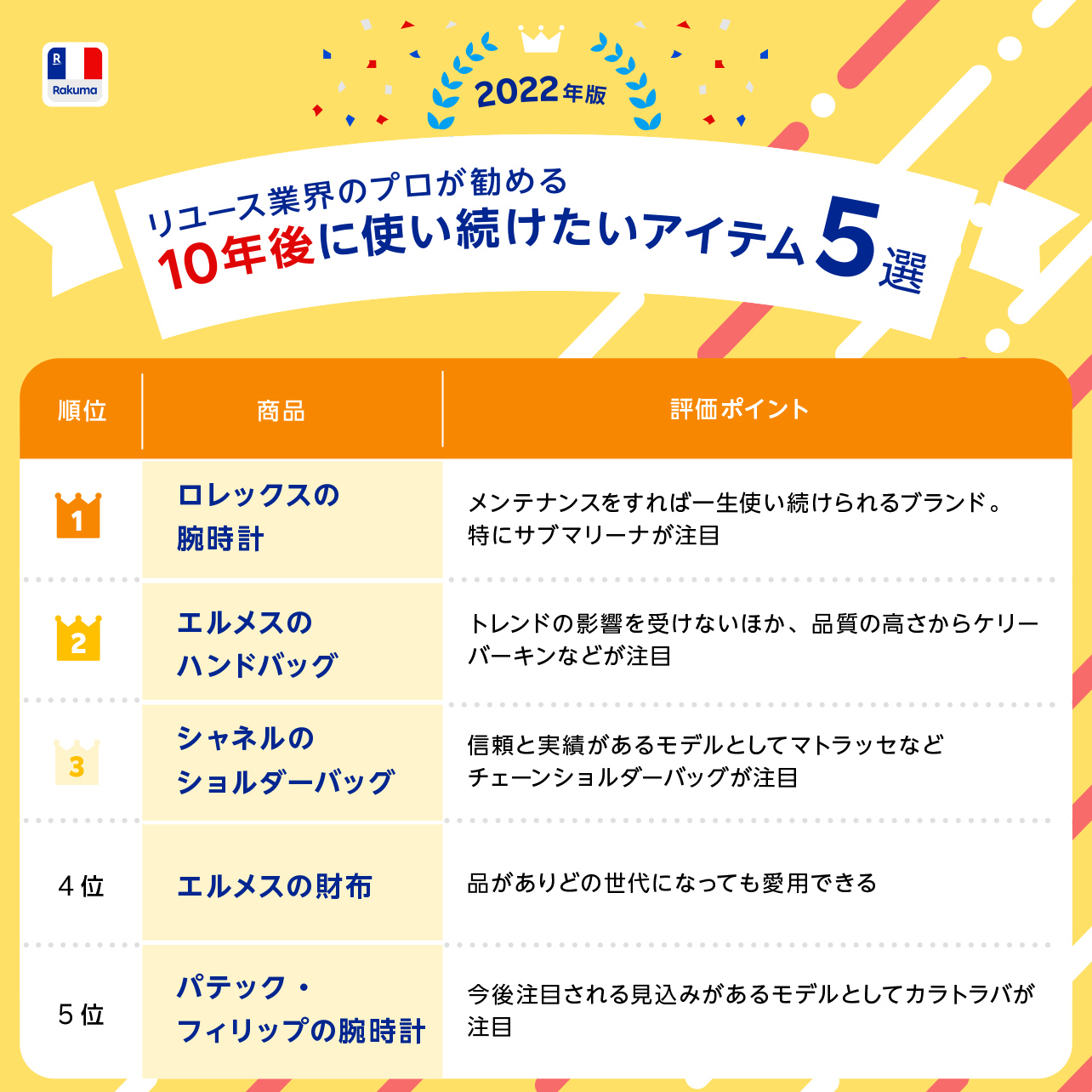 ・選出方法: 「楽天ラクマ」が運営する「ラクマ公式ショップ(リユース)」に出店するリユース事業者を対象に、「楽天ラクマ」に限らず2022年の年間を通じて特に売れたアイテム、5年後、10年後も使い続けられるアイテムについてアンケート調査を実施し、得られた内容から「楽天ラクマ」が独自に集計した100選