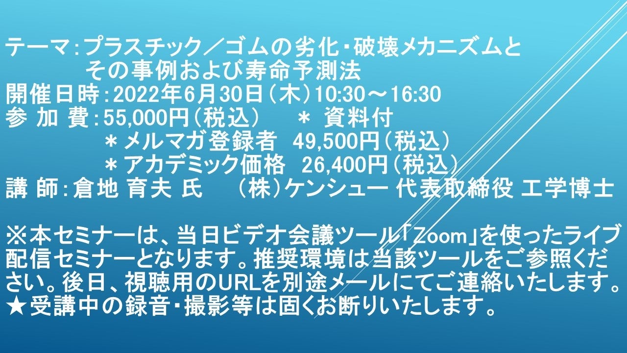 先端技術情報や市場情報を提供している(株)シーエムシー・リサーチ(千代田区神田錦町: https://cmcre.com/ )では、 各種材料・化学品などの市場動向・技術動向のセミナーや書籍発行を行っておりますが、 このたび「プラスチック/ゴムの劣化・破壊メカニズムとその事例および寿命予測法」と題するセミナーを、 講師に倉地 育夫 氏 (株)ケンシュー 代表取締役 工学博士)をお迎えし、2022年6月30日(木)10:30より、 ZOOMを利用したライブ配信で開催いたします。 受講料は、 一般:55,000円(税込)、 弊社メルマガ会員:49,500円(税込)、 アカデミック価格は26,400円(税込)となっております(資料付)。