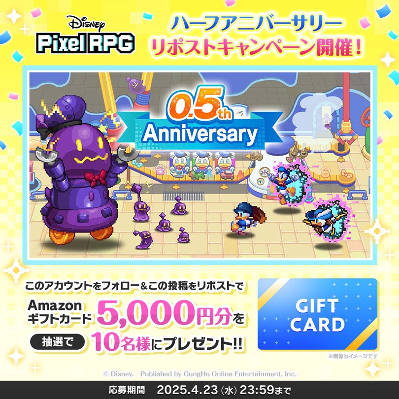 『ディズニー ピクセルRPG』公式Xアカウントでは、抽選で5,000円分のAmazonギフトカードが当たる「ハーフアニバーサリーリポストキャンペーン」を開催中です。