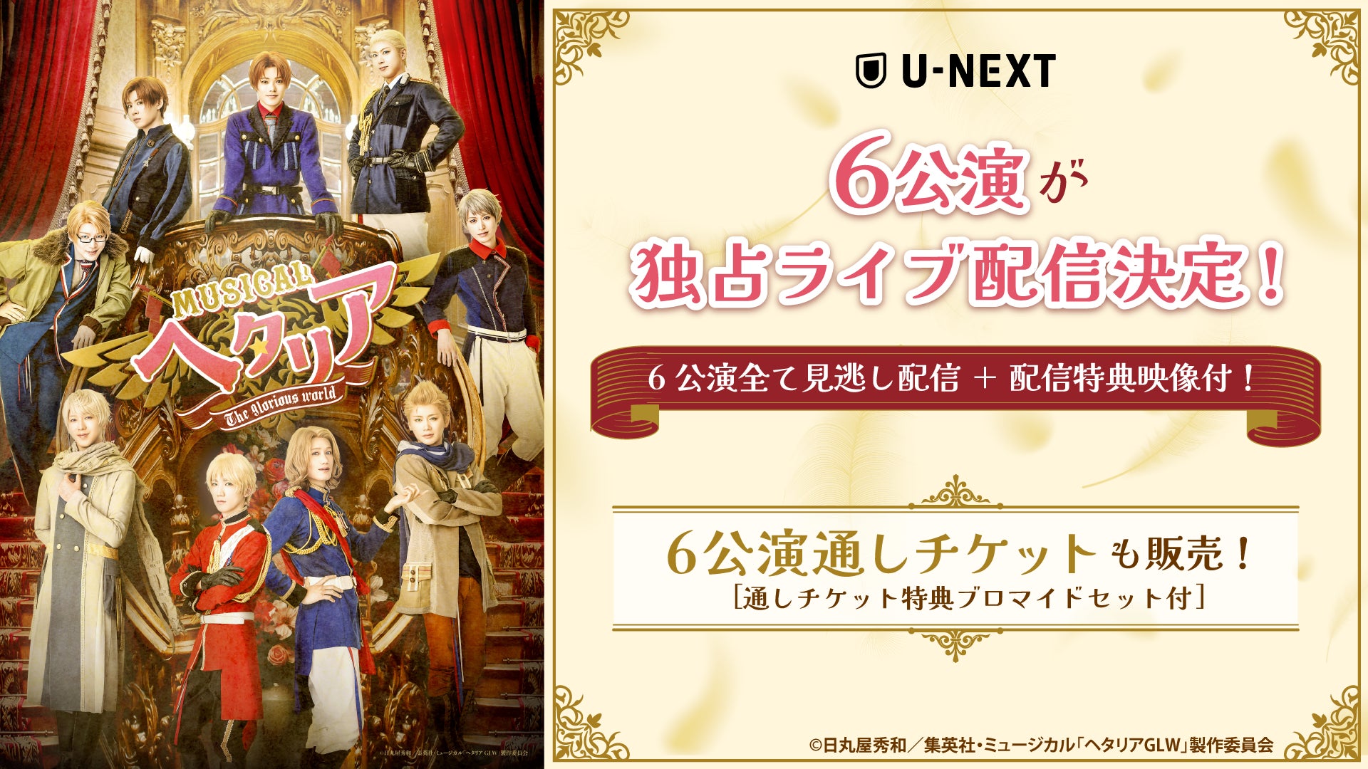 USEN&U-NEXT GROUPの株式会社U-NEXT(本社:東京都品川区、代表取締役社長:堤 天心)が運営する動画配信サービス「U-NEXT」は、2024年8月9日(金)より開催されるミュージカル「ヘタリア~The glorious world〜」を独占でライブ配信いたします。ライブ配信の対象となるのは、京都の8月11日(日・祝)18:00/8月12日(月・祝)13:00<京都千秋楽>、大阪の8月18日(日)12:30/8月19日(月)13:00<大阪千秋楽>、東京の9月7日(土)18:00/9月8日(日)13:00<大千秋楽>の6公演です。また前回に引き続き、6公演通しチケットも販売予定です。