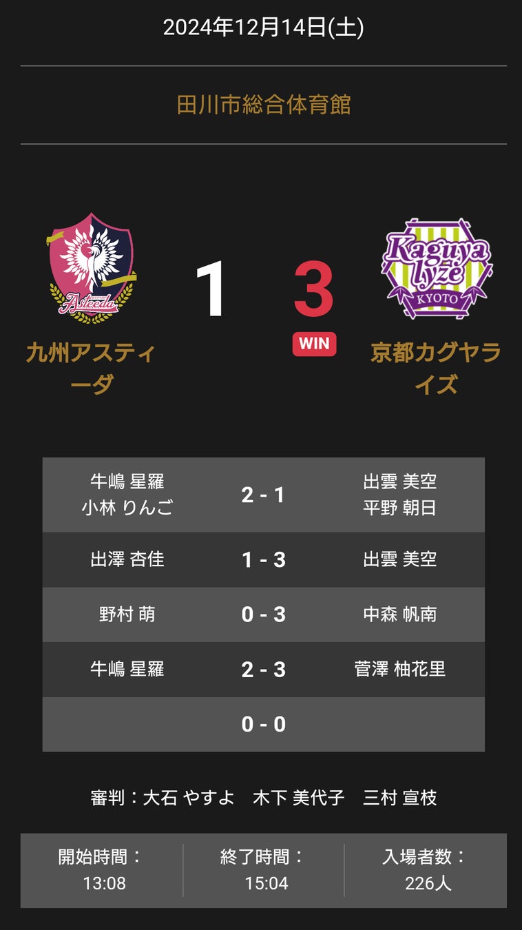 ノジマTリーグ 2024-2025 公式戦 12月14日開催 九州アスティーダ vs 京都カグヤライズ 試合結果