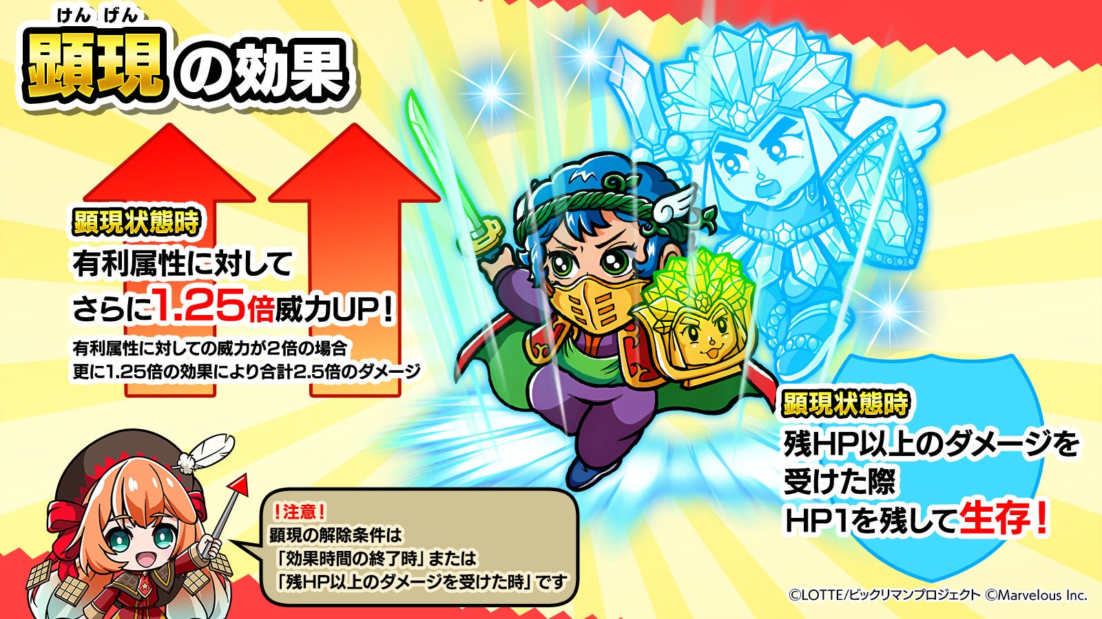 バトルに有利な効果「顕現(けんげん)」を発動します。