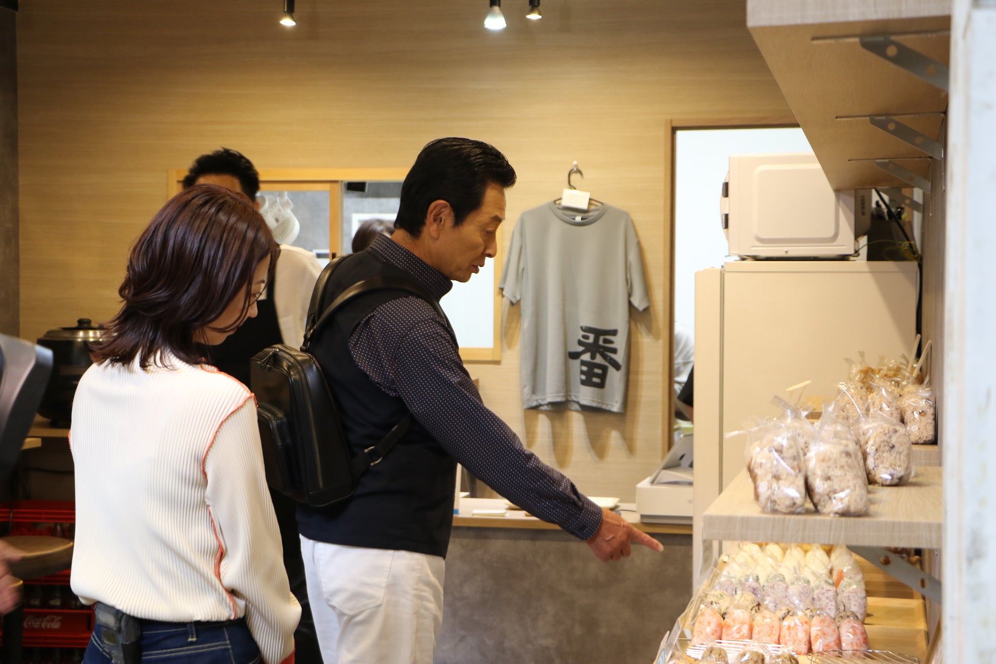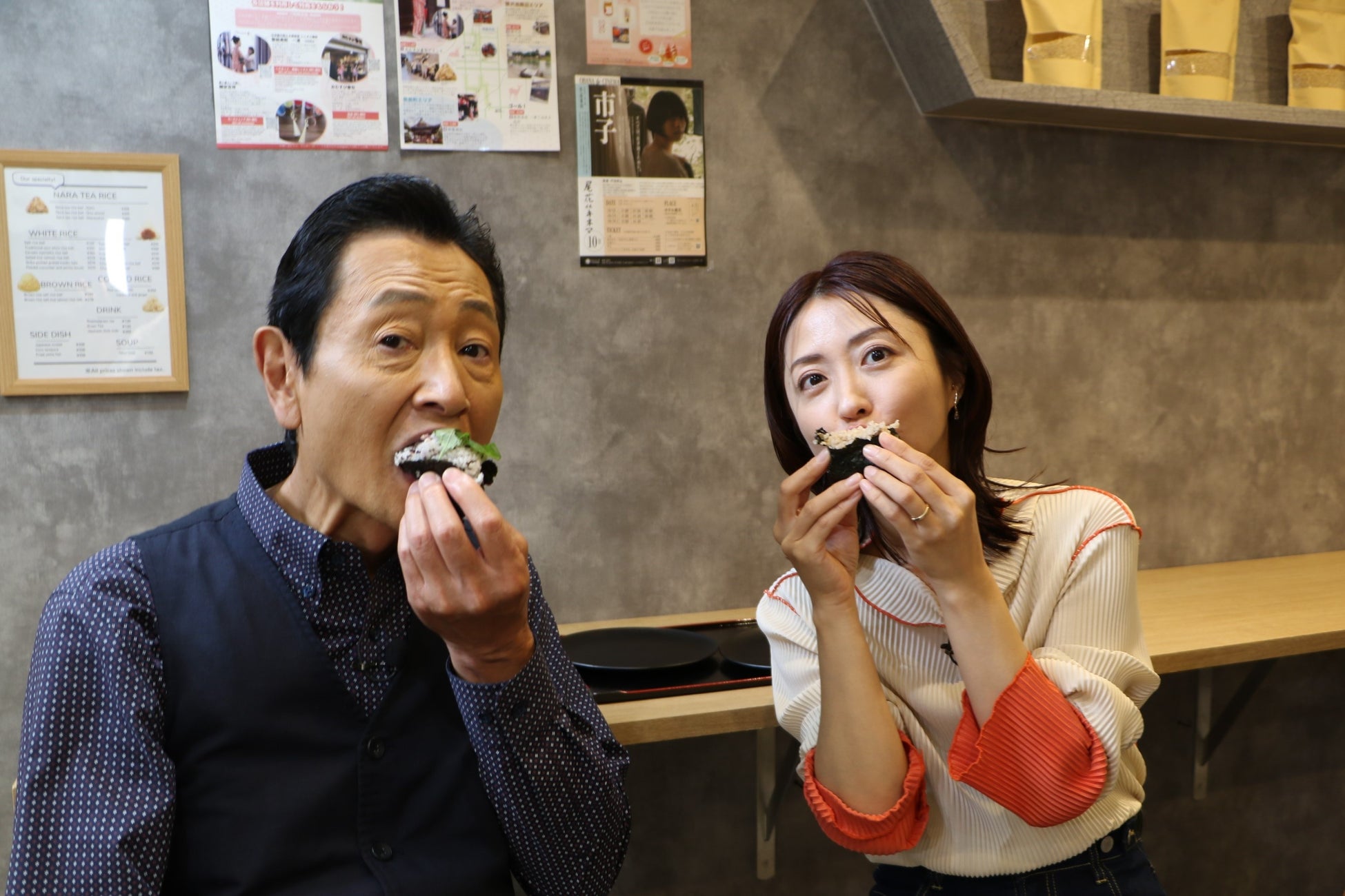 朝からお酒を楽しんだ2人は【もちいどの商店街】へ。ほうじ茶で炊いた≪茶飯≫は奈良の郷土料理で、その茶飯を使用した『おむすび』が人気のお店で、2人が気になったおむすびをいただくことに。