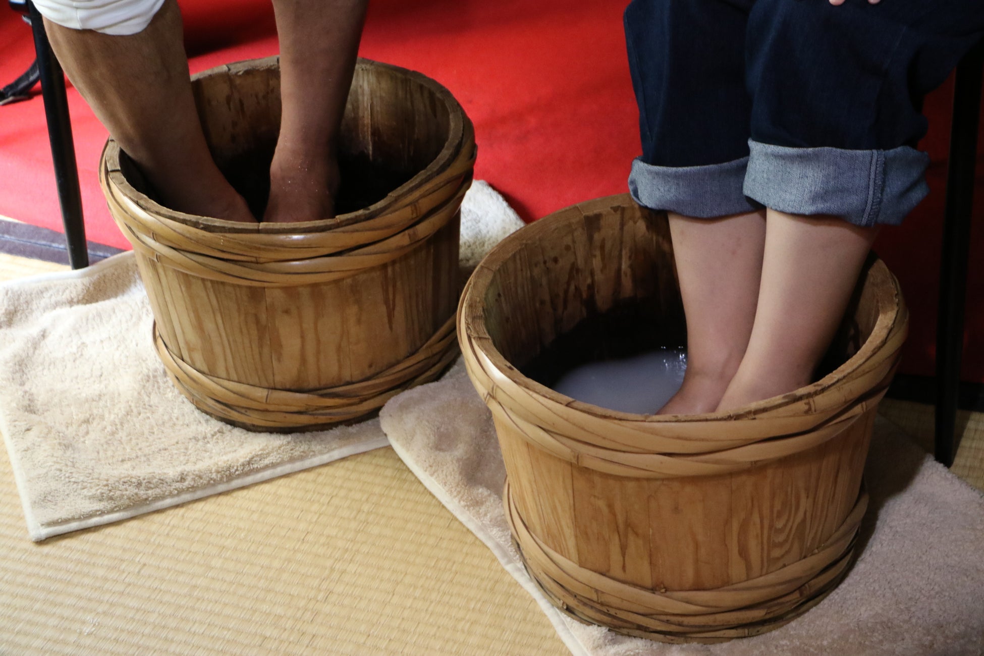 そして次に向かったのは足湯カフェ。こちらも三田村が以前訪れたことがある場所。なんと1人に1つずつの吉野杉の樽桶が用意され、お湯は宇治茶の茶葉入りのものと米ぬかが入ったものから選べます。樽桶はお酒の樽桶を作ってる職人さんにお願いして特注で足湯用に作っていただいたそうです。