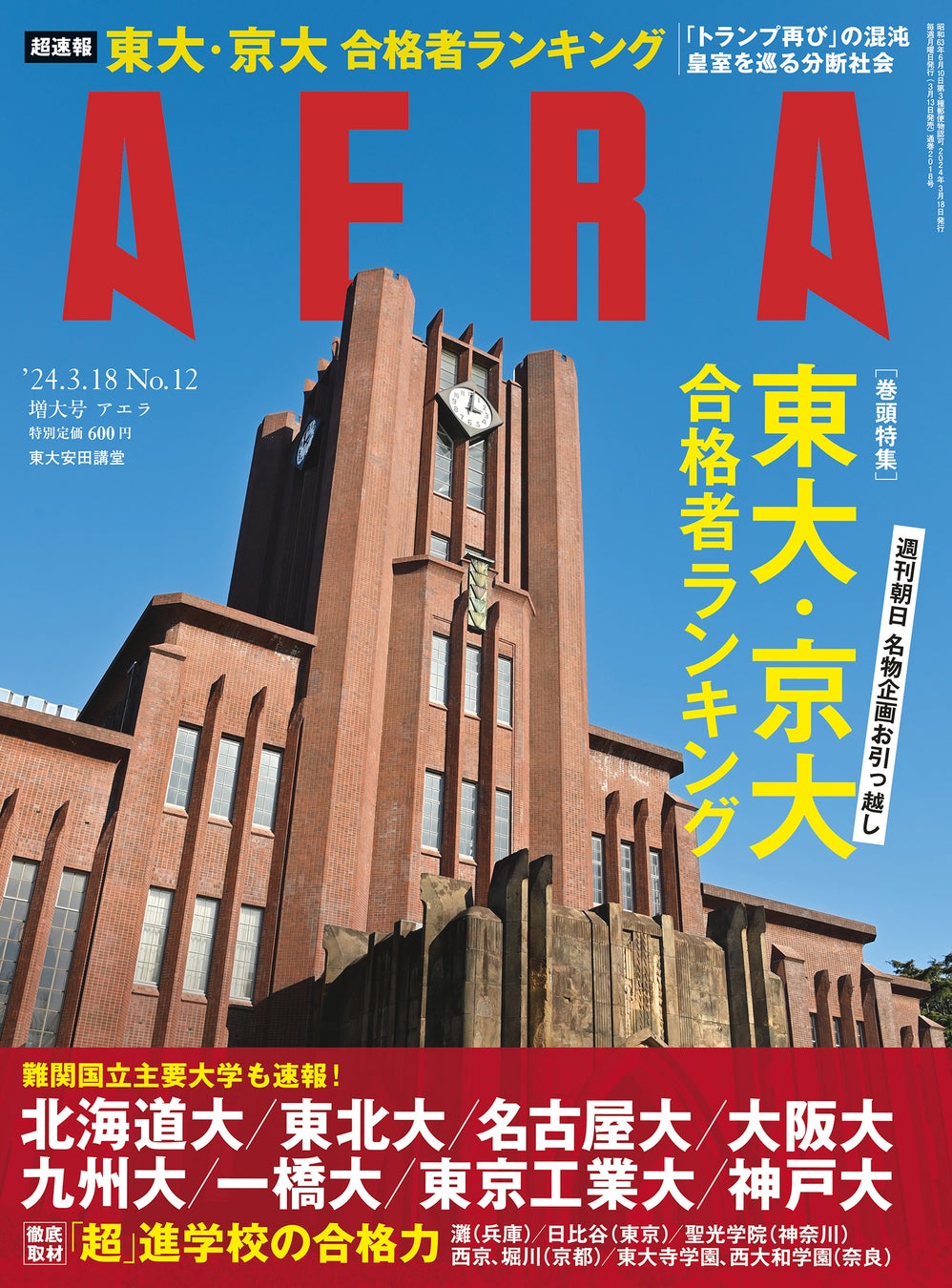 3月13日発売のAERA3月18日増大号は、大学合格ランキングシリーズのなかでも、最も“速報”に力を入れる、東大・京大+難関国立主要大学「合格“超”速報号」です。3月10日に合格発表があったばかりの東大・京大の合格者高校ランキングを圧倒的な速さで詳報します。普段より大幅に増ページして、「1人合格」の高校もすべて網羅したデータを完全収録しました。受験生やその家族だけでなく、母校の動向が気になる方々にも“絶対保存版”の一冊です。そしてAERAは、データだけではありません。灘、日比谷、聖光学院など“超進学校”を徹底取材し、その「合格力」にも迫っています。日本発の作品がW受賞したアカデミー賞や、世界が注目する米大統領選についての記事もあります。大好評連載「松下洸平 じゅうにんといろ」は、俳優の仲野太賀さんとの対談のラスト回です。良きライバルをテーマに語り合います。ほかにも、多彩な記事が詰まった一冊をぜひご覧ください。今号は、大学合格速報のため、発売日が通常とは異なり、3月13日(水)となりますので、ご注意ください。