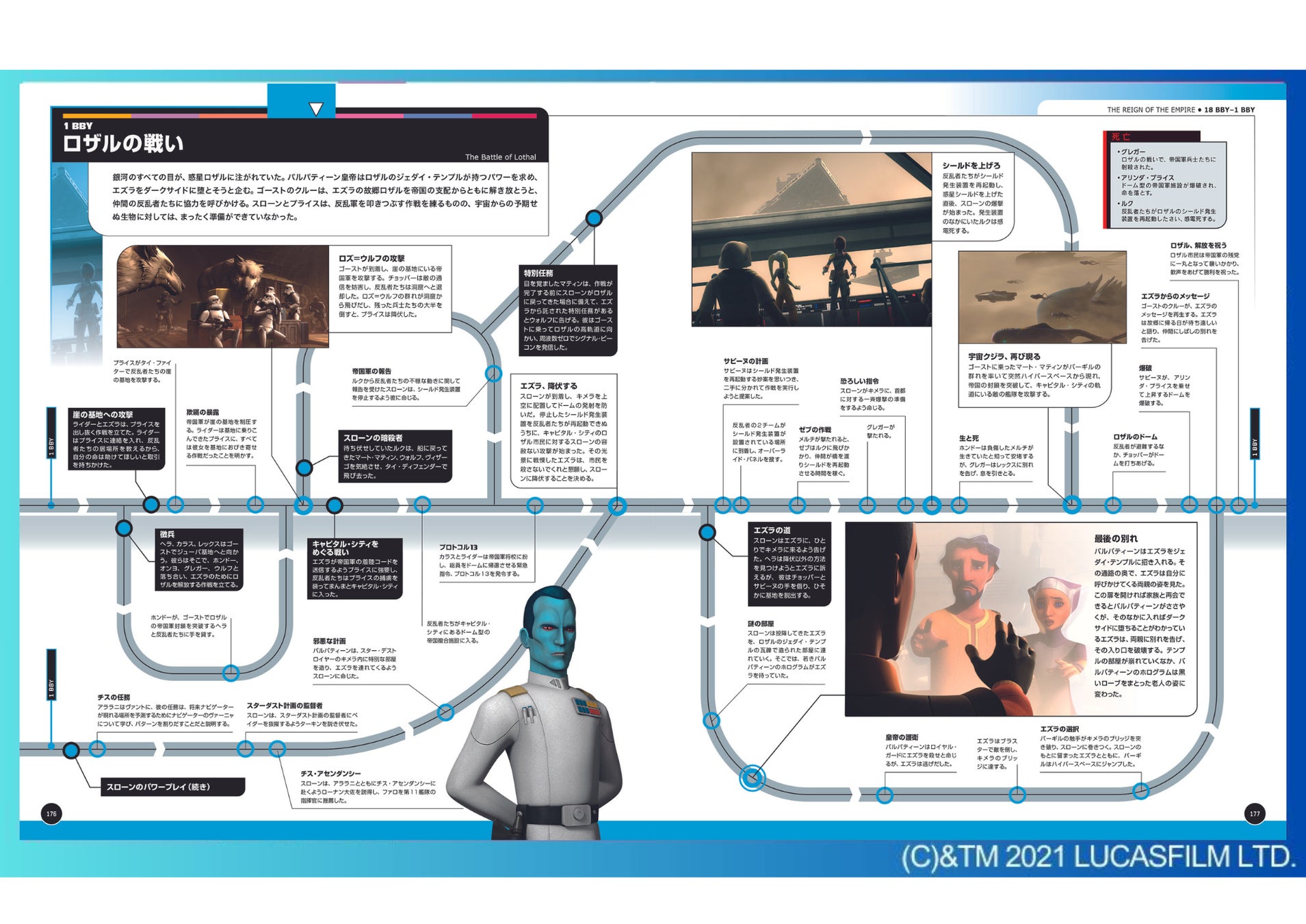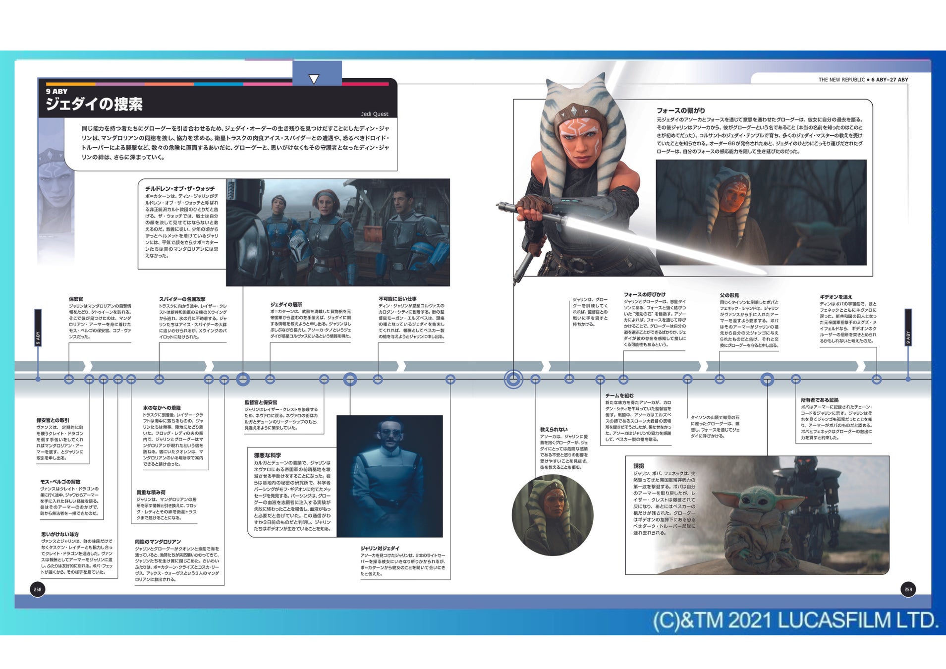 単なる歴史年表だけでなく、ルークやアナキン、オビ=ワン、ボバ・フェット、マンダロリアン(ディン・ジャリン)などの人物、ナブーやコルサントなどの惑星に焦点を当てた小史もビジュアルもビジュアルにて展開。