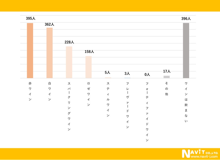 「飲むワインの種類は何ですか?」という質問を複数回答可で行ったところ、「赤ワイン」が395人、「白ワイン」が362人、「ロゼワイン」が158人という順になりました。定番の赤ワインや白ワインが人気のようです。