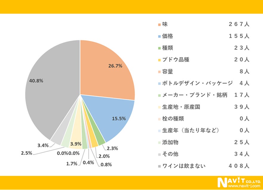 「ワインを購入する際、最も重視しているポイントは何ですか?」という質問については、「味」が26.7%、「価格」が15.5%、「種類」が2.3%という順になりました。味を最も重視する方が多いようです。