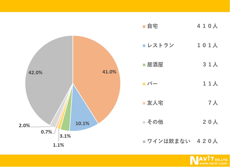 「どこでワインを飲むことが1番多いですか?」という質問については、「自宅」が41.0%、「レストラン」が10.1%、「居酒屋」が3.1%という順になりました。家で飲んでいる方が多いようですね。
