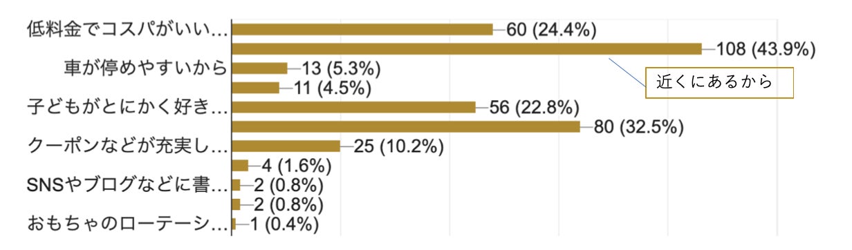 こちらも一番多かったのは「低料金でコスパがいいから」で5割以上。また2番目も4割以上で「近くにあるから」でした。続いて「ファミレス」には入っていなかった「美味しいから」という理由も4割以上。「安くて美味しいもの」を食べたいときは、「ファミレス」以外を選ぶ家庭が多いようです。