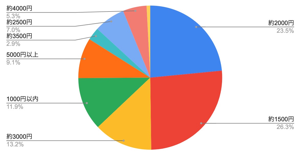 「約1500円」と「約2000円」がツートップの回答。昼より予算が増えるものの、夜の外食でも約50%が「2000円以内」と決めていることが判明しました。一方で「5000円以上」という回答も9%ほど存在。ファミレスも選ぶお店によって、価格がだいぶ変化がありそうです。