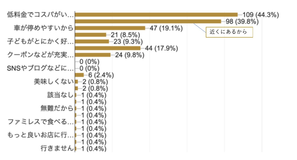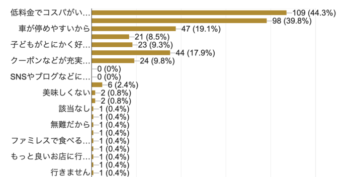 人気店を見てもわかるように、ファミレスを選ぶ一番の理由はで44%以上で「低料金でコスパがいいから」。安いことは大前提で、「メニューが豊富でおいしい」といった付加価値を求めていることがわかる結果となりました。