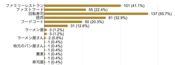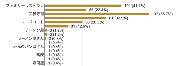 ついで人気なのが「ファミリーレストラン」。食べたいものがバラバラでも、メニュー豊富なファミレスや、いろんなお店があるフードコートは、気楽でいいと人気です。