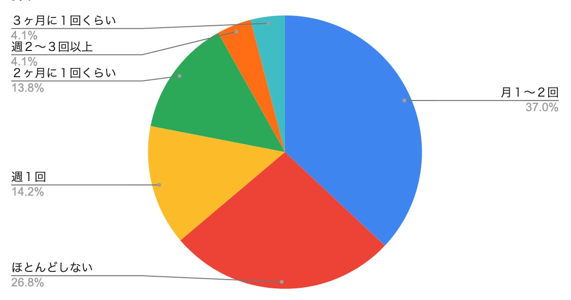 一番多かった回答が「月1、2回」で37%。続いて「ほとんどしない」という回答が約26%。また13%が「2ヶ月に1回くらい」と回答。