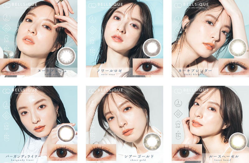 『BELLSiQUE』は、“カラーを楽しむ大人のカラコン”がコンセプトのカラコンブランドです。繊細なぼかしドットと透き通るような色味で作る水彩画のようなデザインが瞳に溶け込み、その人自身の魅力を自然に引き立たせるレンズラインナップを全6種類展開しています。
