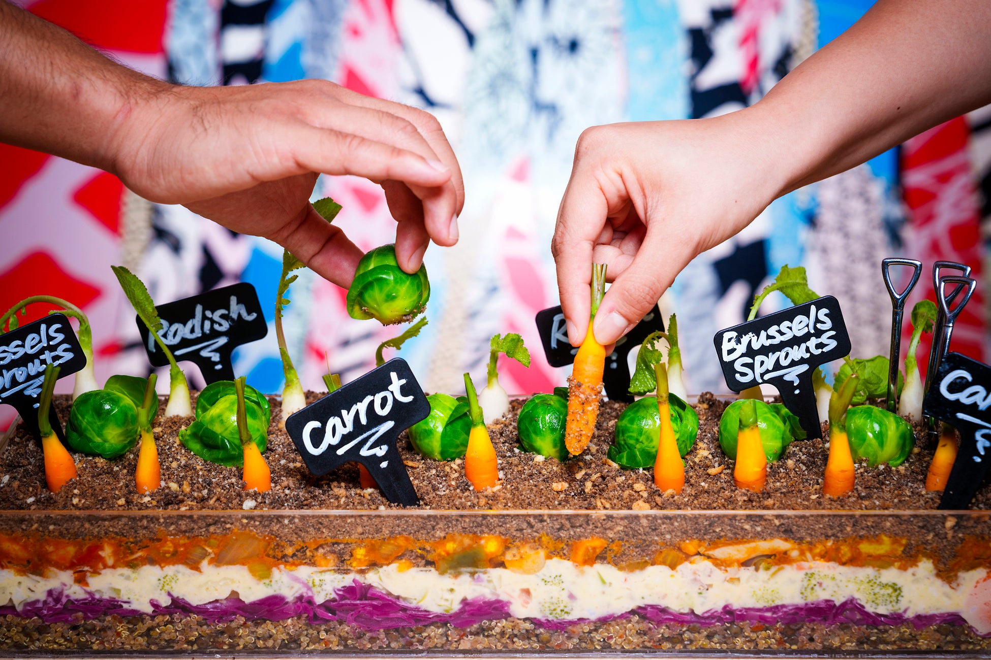 「手」で食べる楽しさを引き出すためにご用意した料理は、テーブルの上に広がる畑から、まるで菜園で収穫するかのように手で摘み取る野菜や、自身のお好みに合わせて20種類以上の具材を組み合わせ、「手」でバランスを取りながら、具材を豪快に積み重ねる楽しさを味わえるハンバーガー、そしてトッピングを自由に選べ、「手」で崩しながら、一口一口贅沢にいただくオリジナルサンデーと多彩なメニューが揃います。